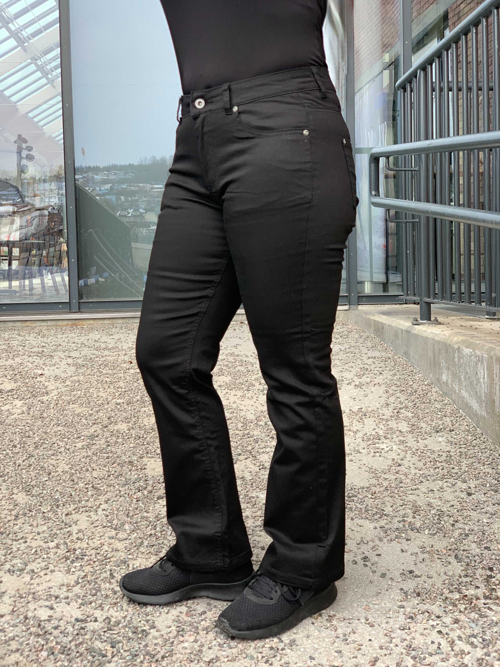 Bukse i twill materiale med litt kortere beinlengde. Modellen er 160cm høy. Bootcut bukse som skrår litt ut nederst. Medium livhøyde, stikklommer foran og vanlige baklommer. Knappelukking med glidelås.