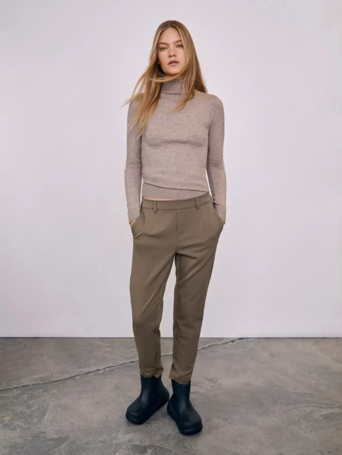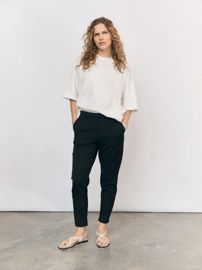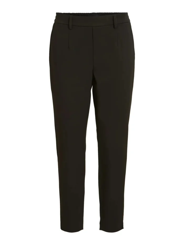 Dressbukse i smal modell med strikk bak i livet og lommer i sidene. Ikke glidelås foran. Beltehemper, ankellengde.