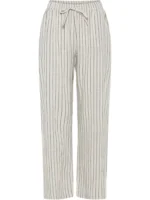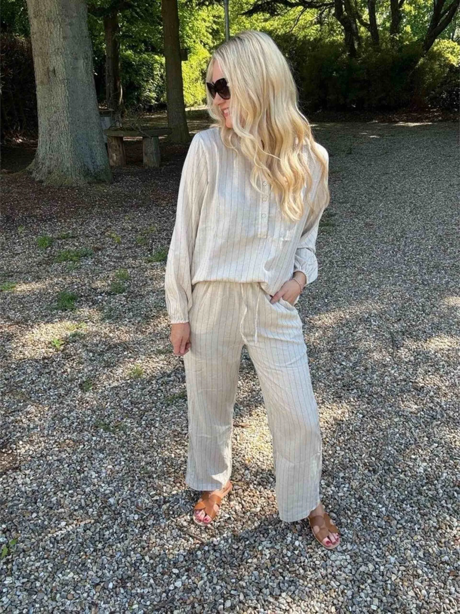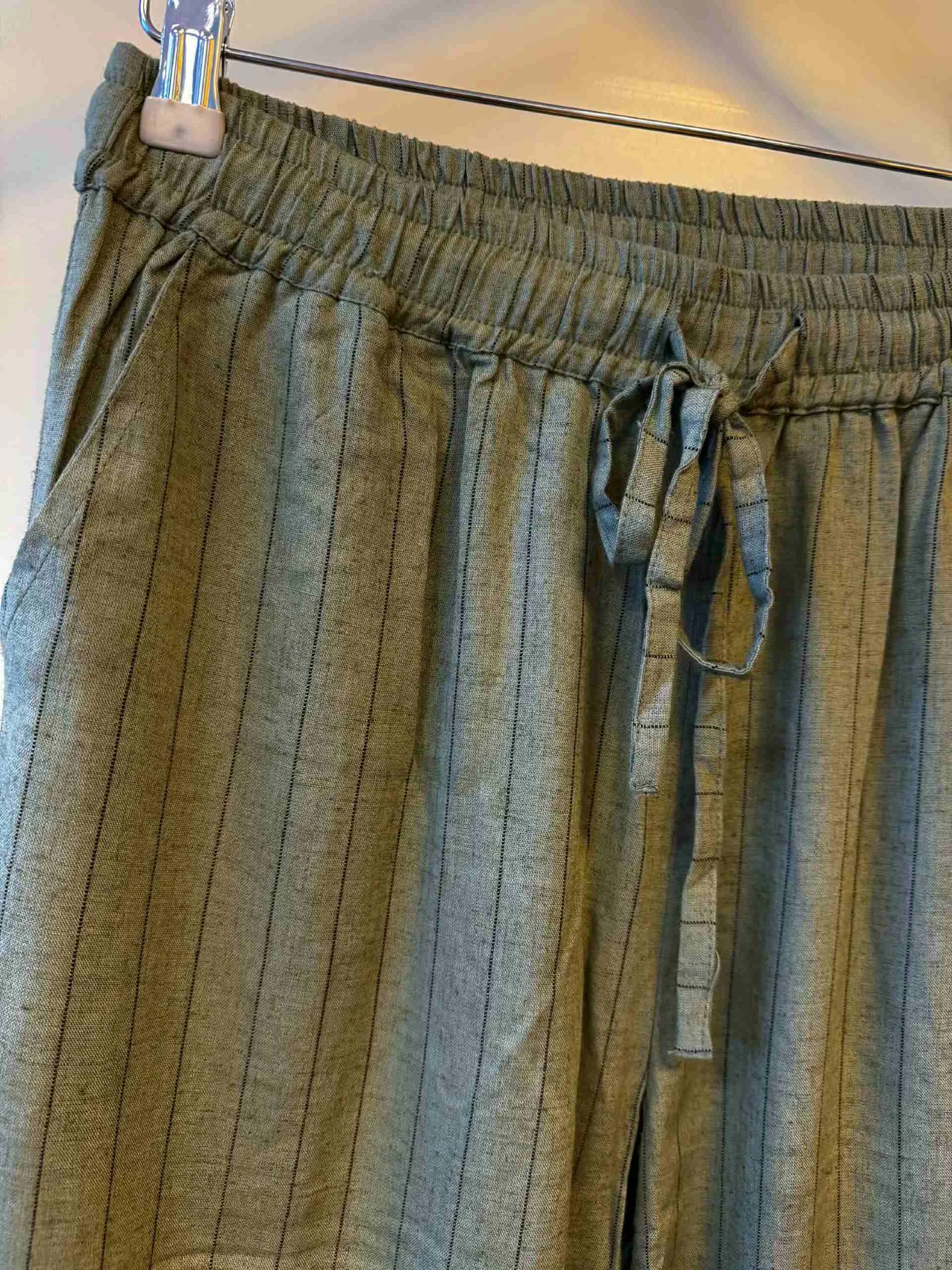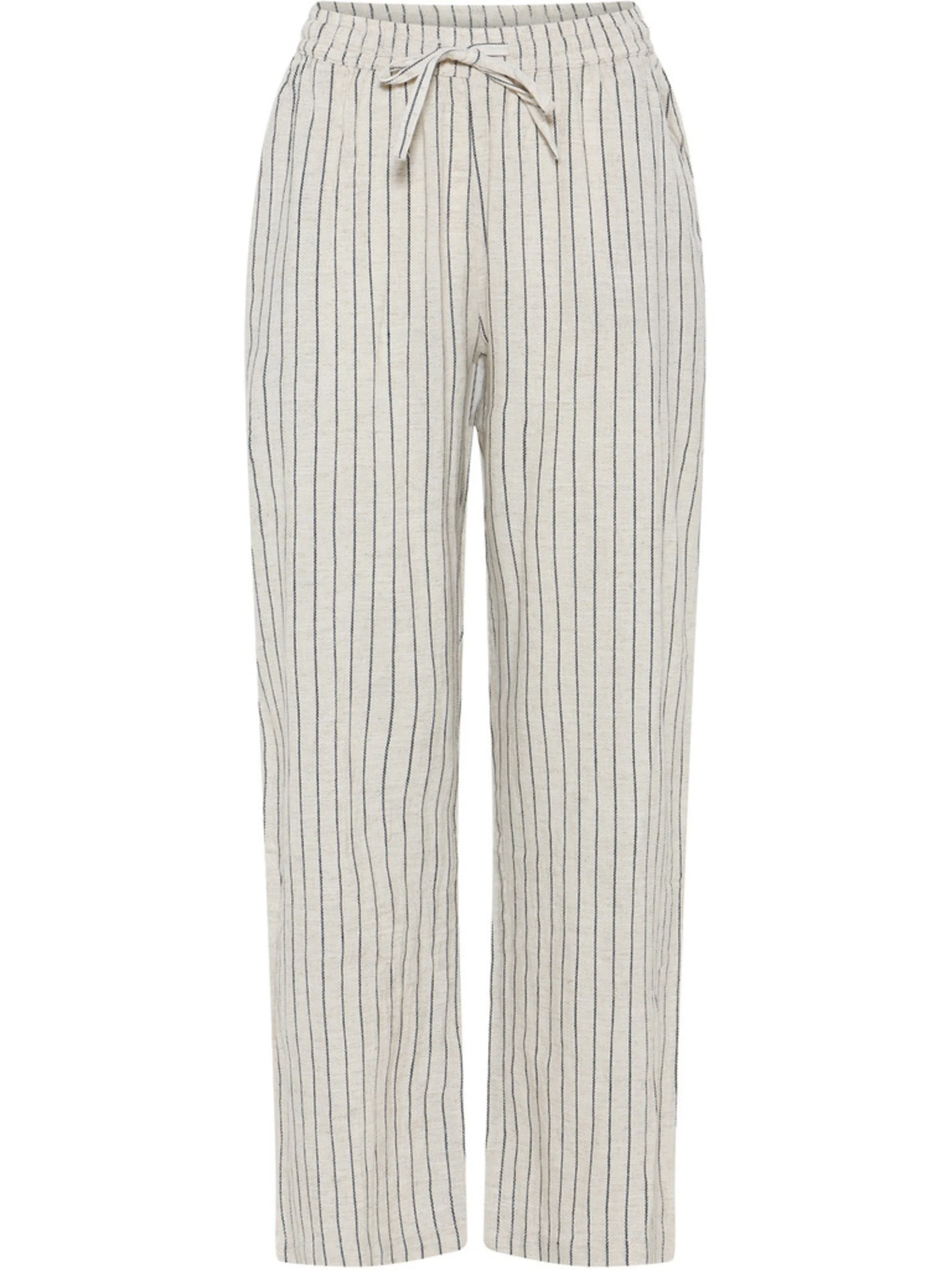 Vide og lette bukser i linblanding. Rett fasong, knyting og strikk i livet. Lommer.