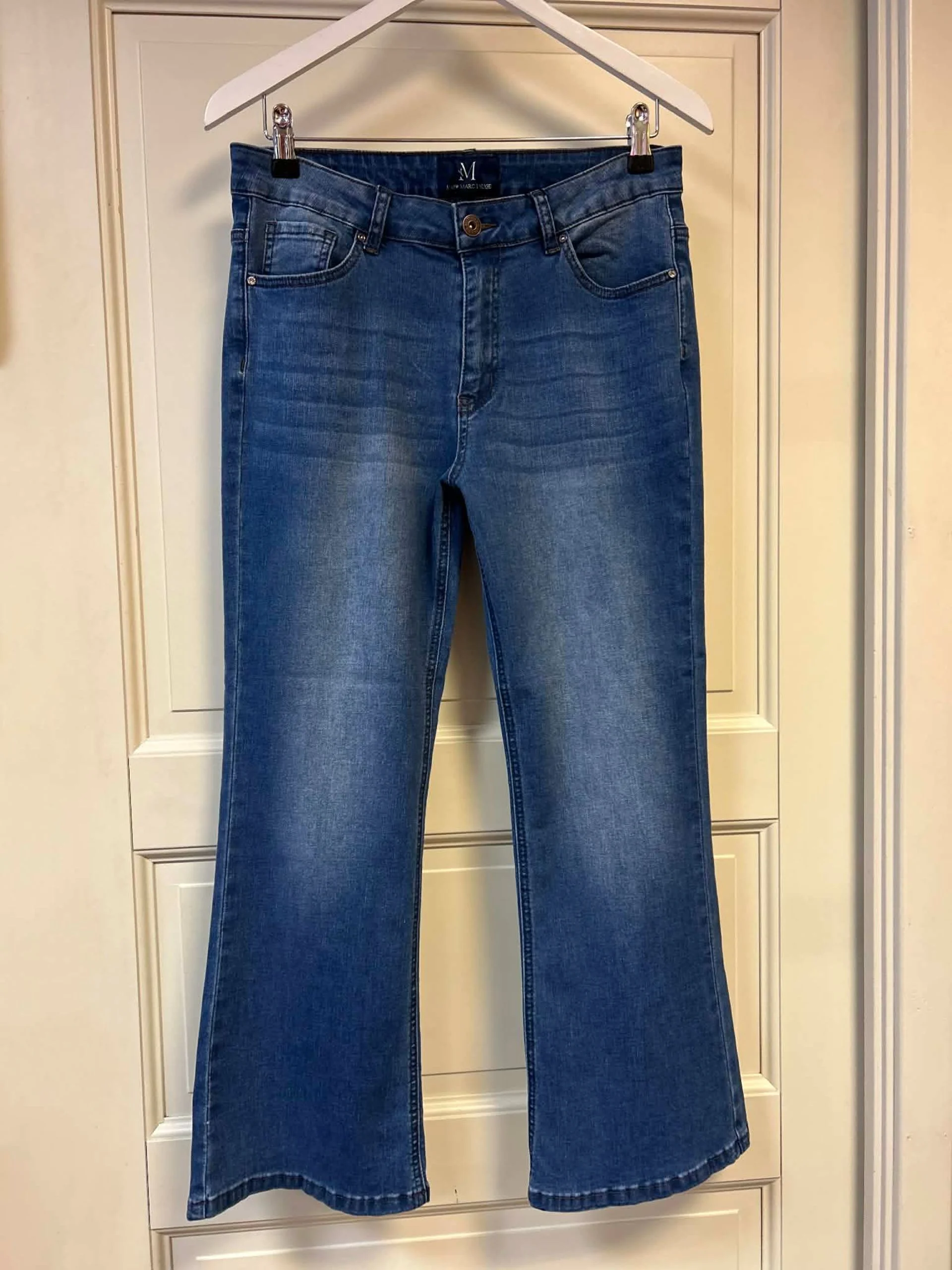 Jeans i bootcutmodell med litt kortere beinlengde. Buksa skrår svakt ut nederst på bena. Glidelåslukking med knapp i front, lommer i sidene, beltehemper og baklommer.