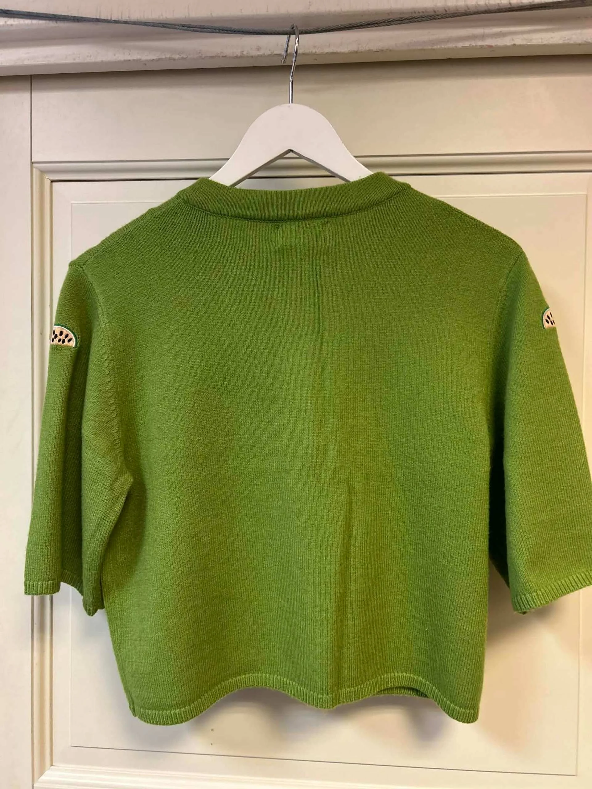 Kort cardigan i myk strikkekvalitet. Halvlange ermer, knapping hele veien i front. Vannmelon motiver kun i front.