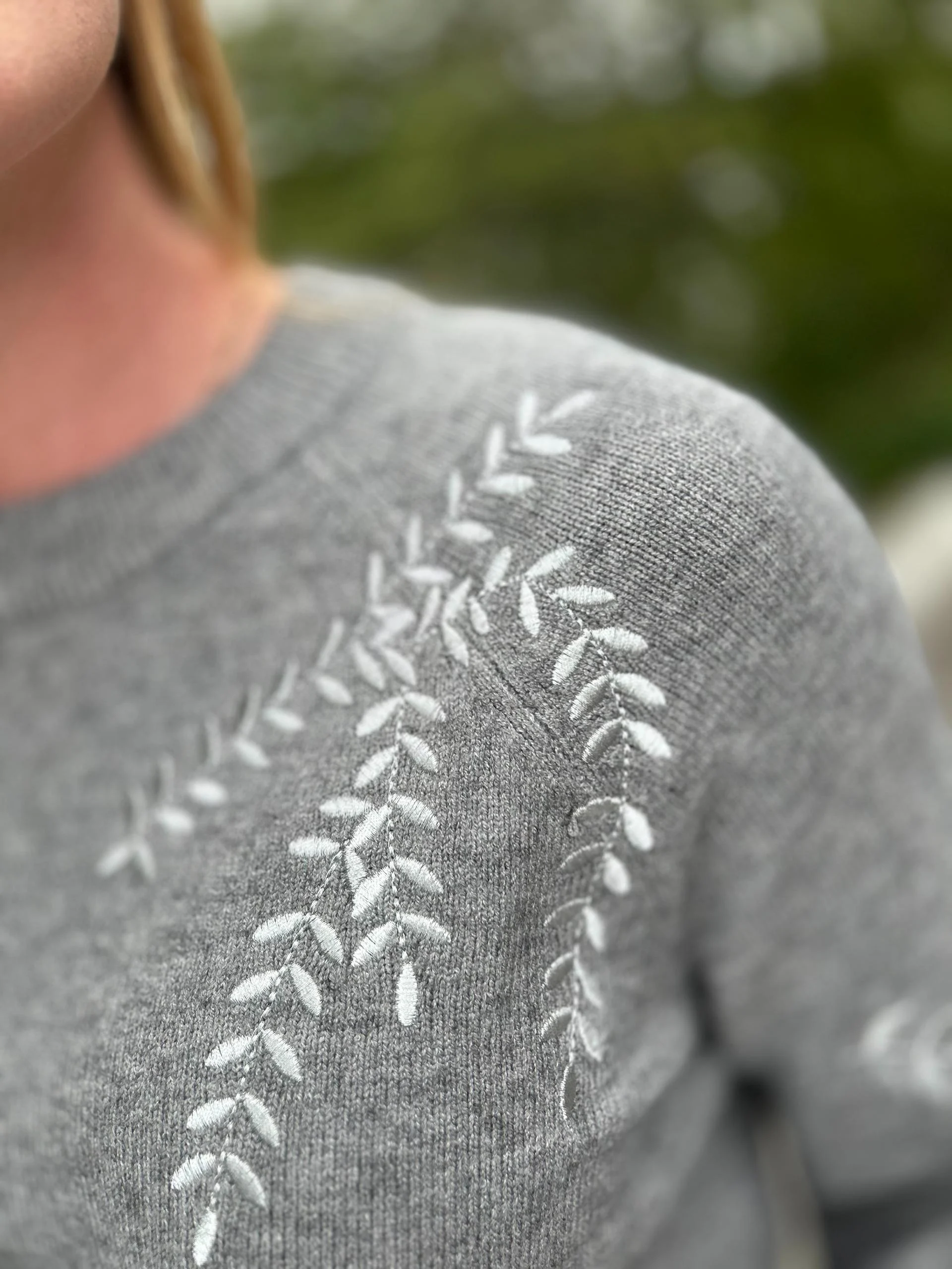 Myk genser med flotte broderier i sølv. Vide ermer.