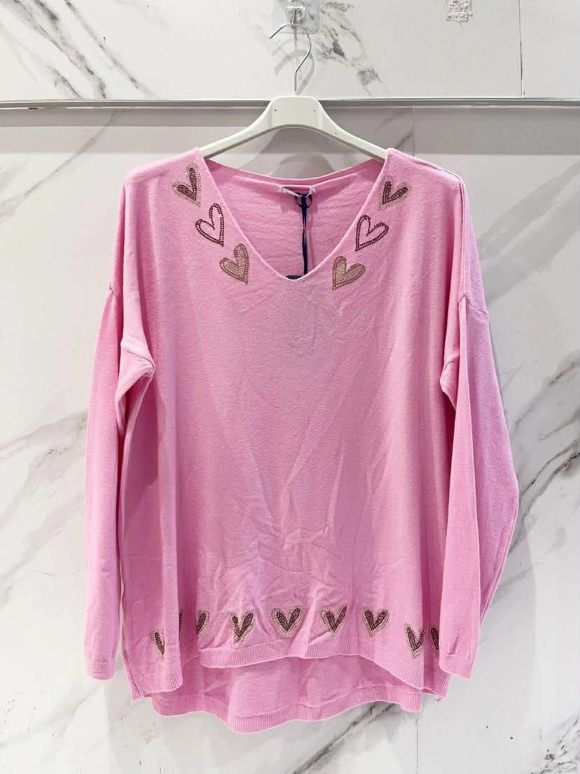 Tynn genser med hjertemotiv med bling ved V-hals og nederst på genseren. Rett fasong.