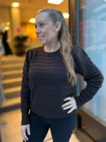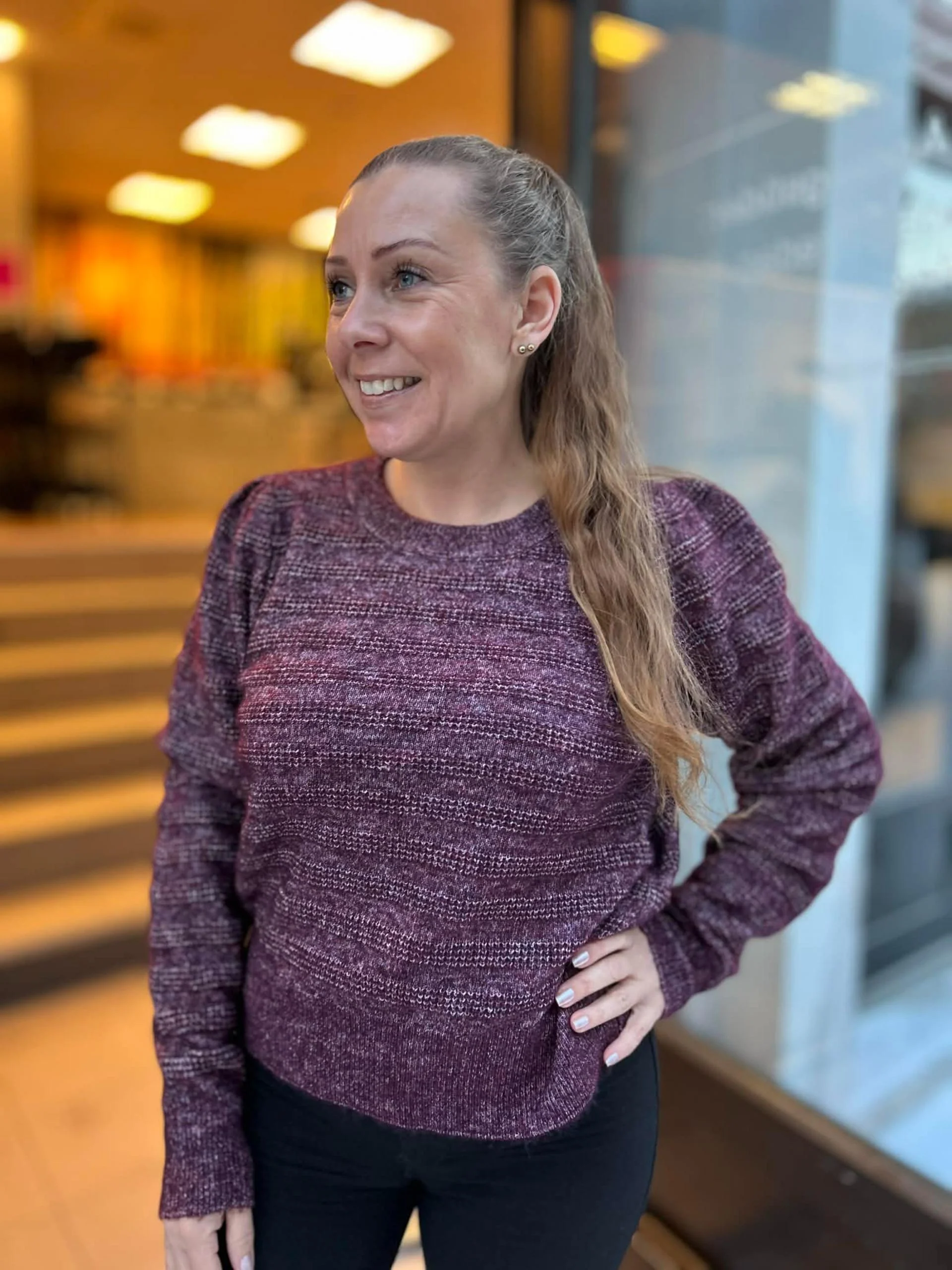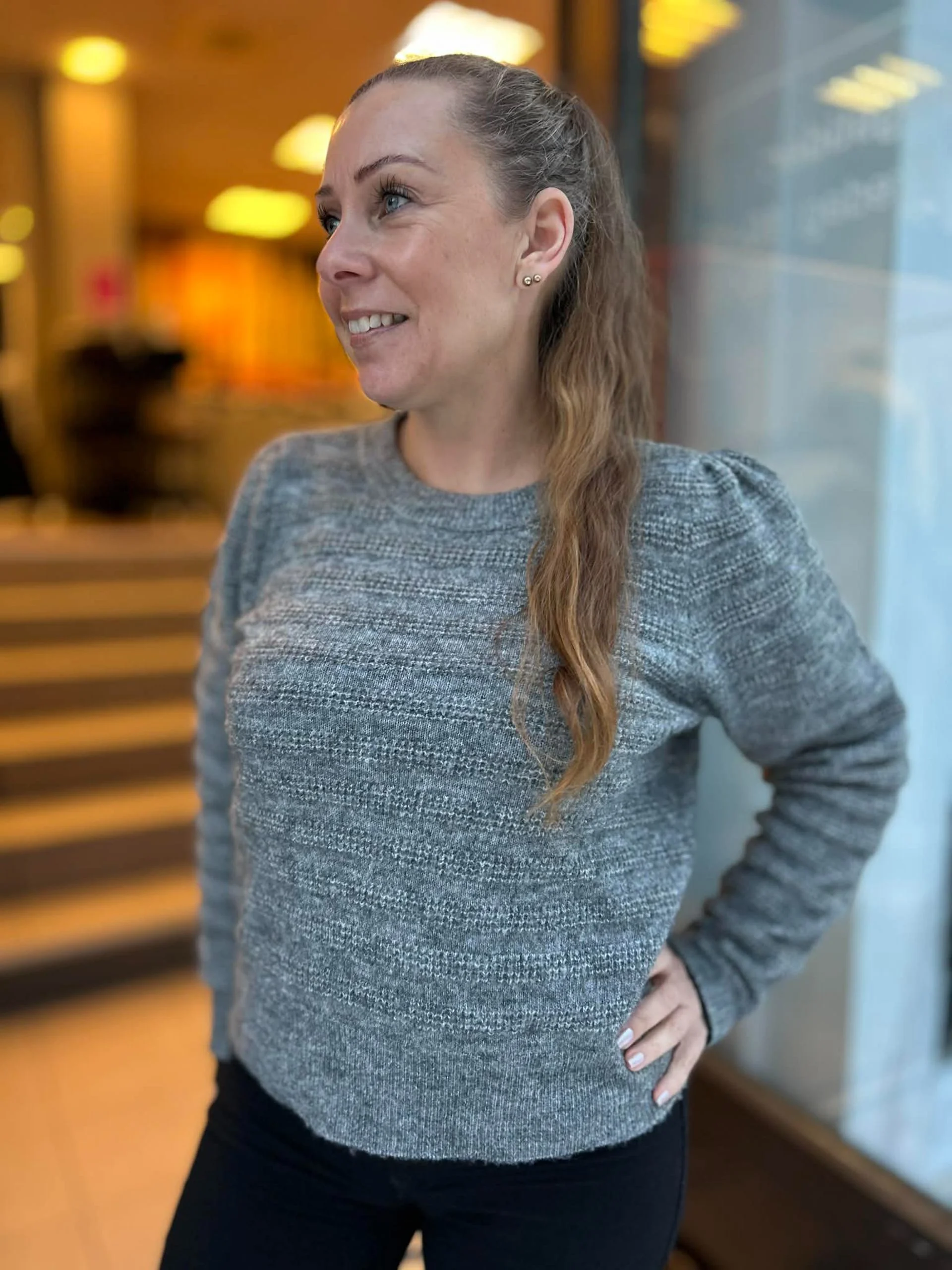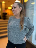 Strikkegenser med rund hals og fin struktur i stoffet. Liten pufferm. Kort fasong.
