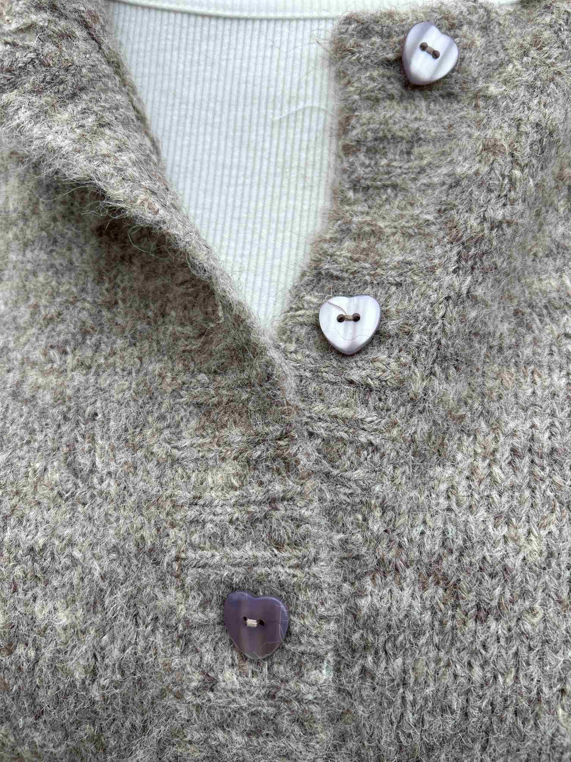 Myk cardigan i strikkekvalitet. Søte hjerteformet knapper hele veien foran. Ledige ermer.