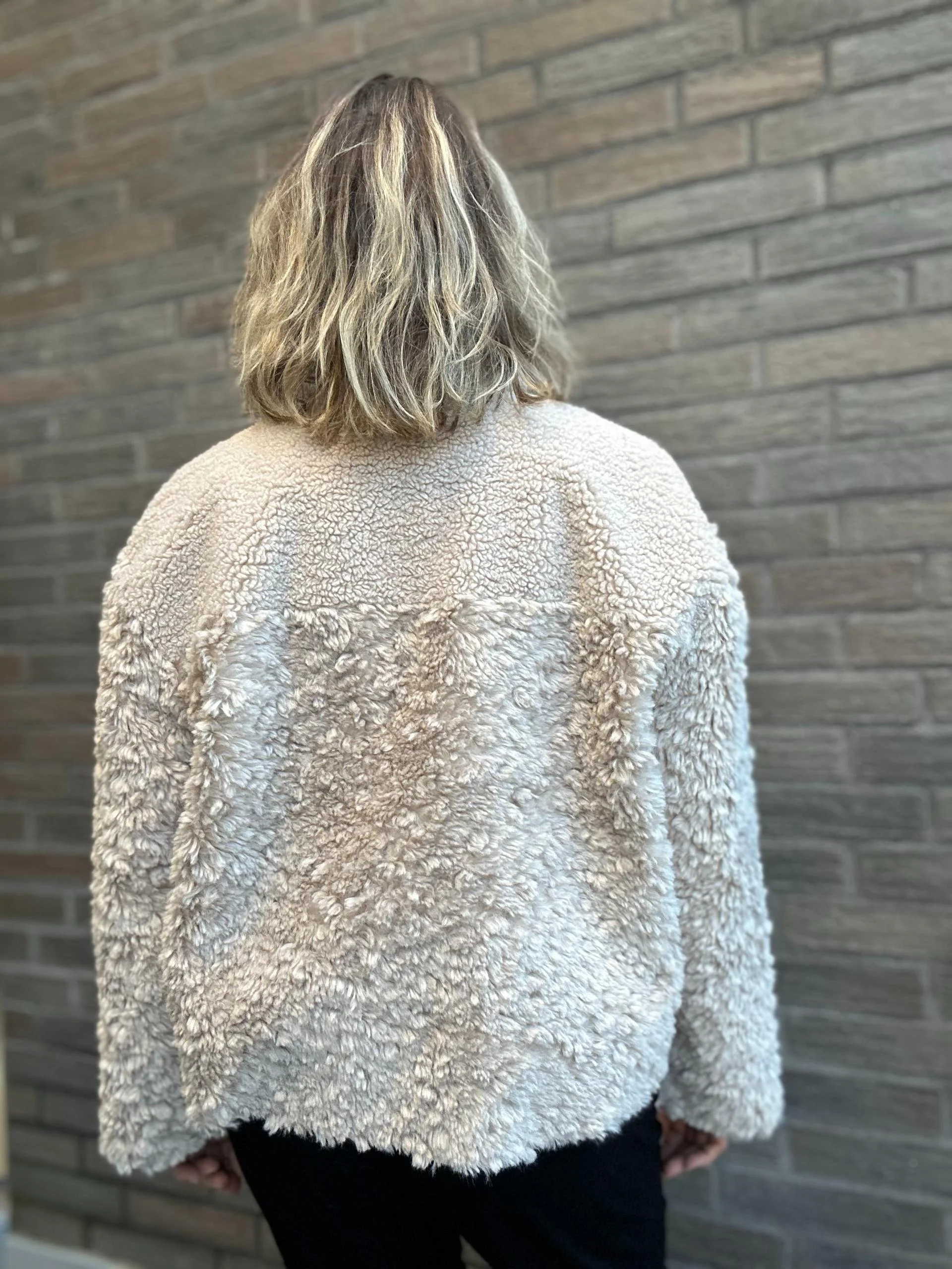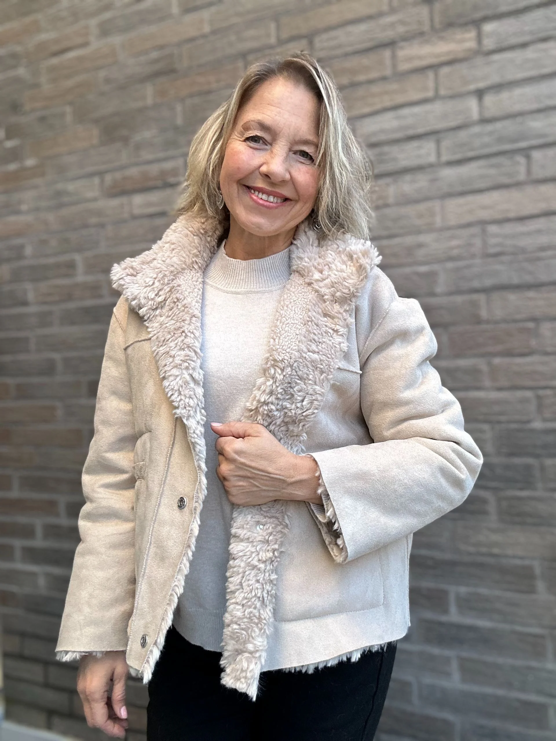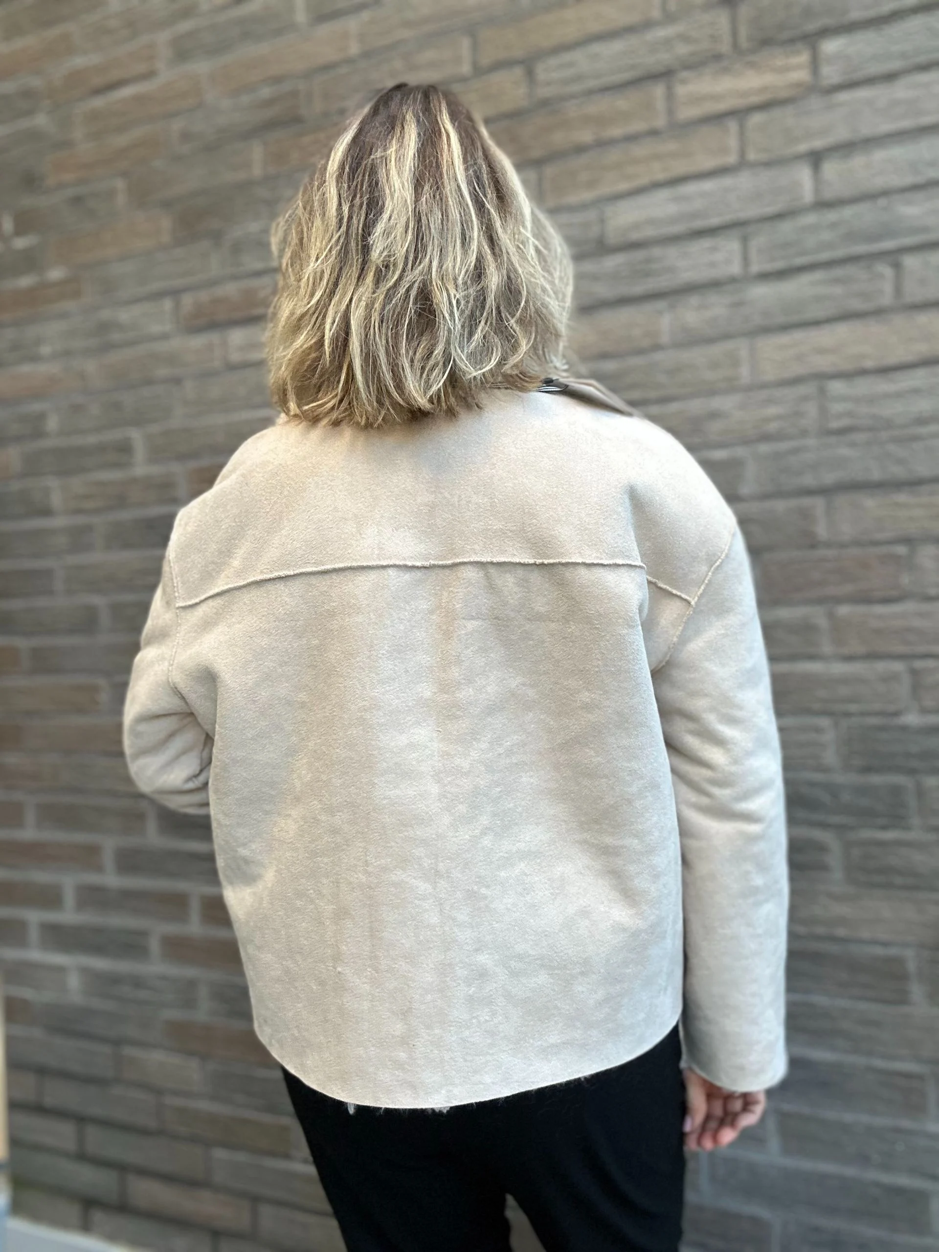 2 i 1 jakke som kan brukes begge veier. Kunstskinn, krage, trykknapper foran. Lommer.