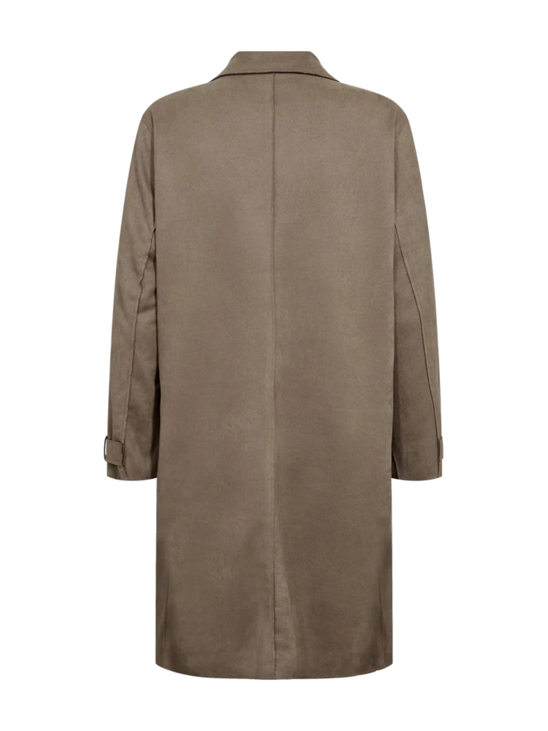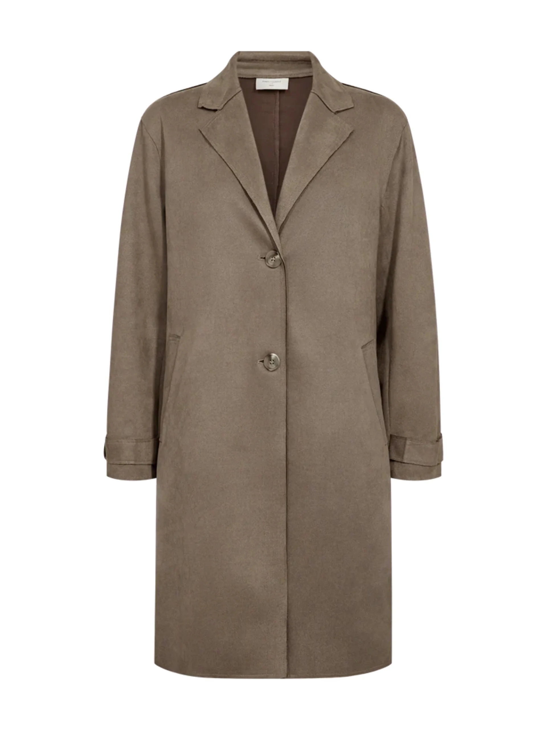 Lang jakke i myk imitert semsket skinn. Rett fasong. Påsydde lommer og krage.