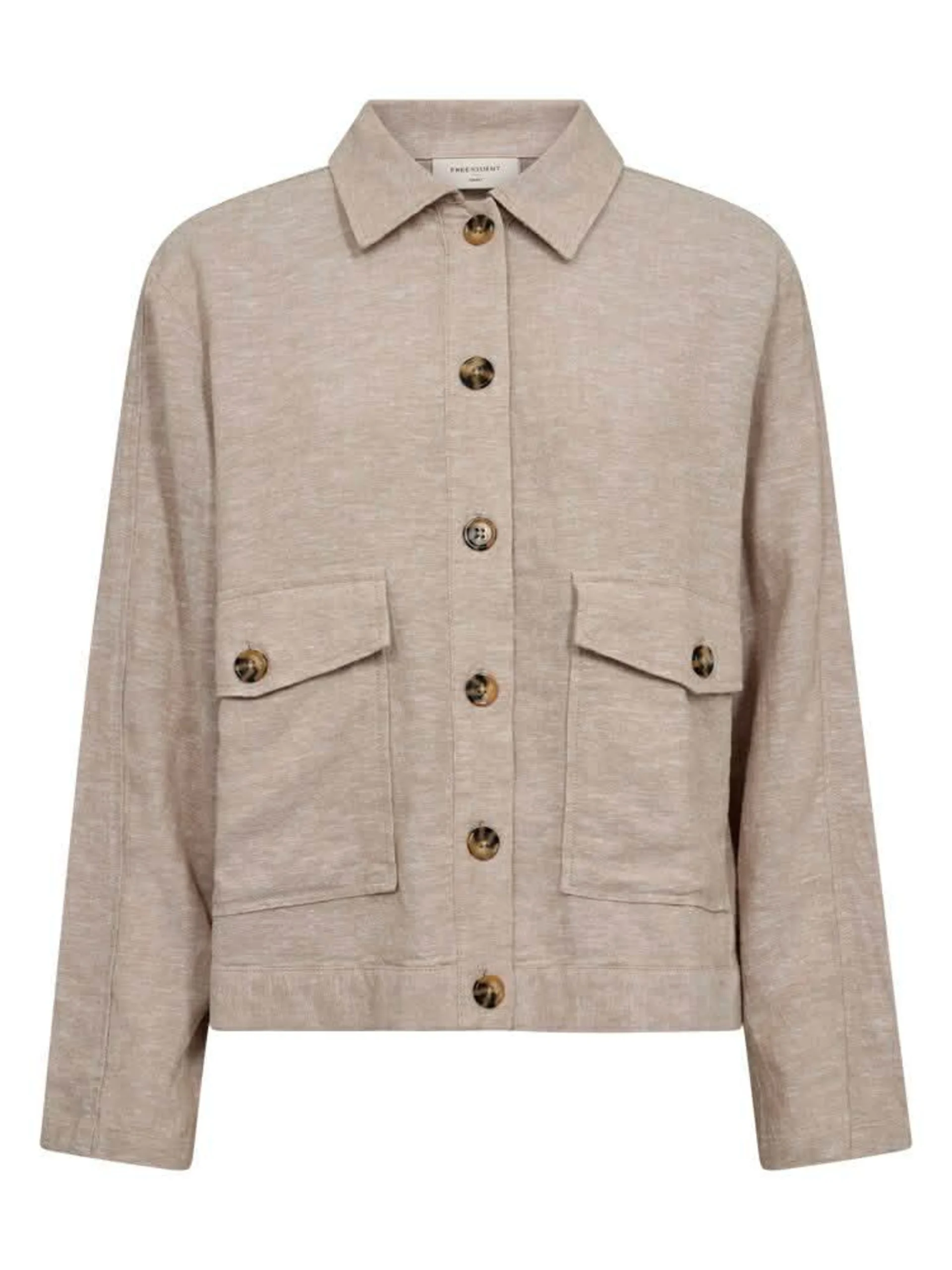Tøff linjakke i rett fasong. Påsydde store lommer i front, knapper.