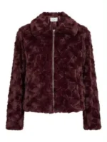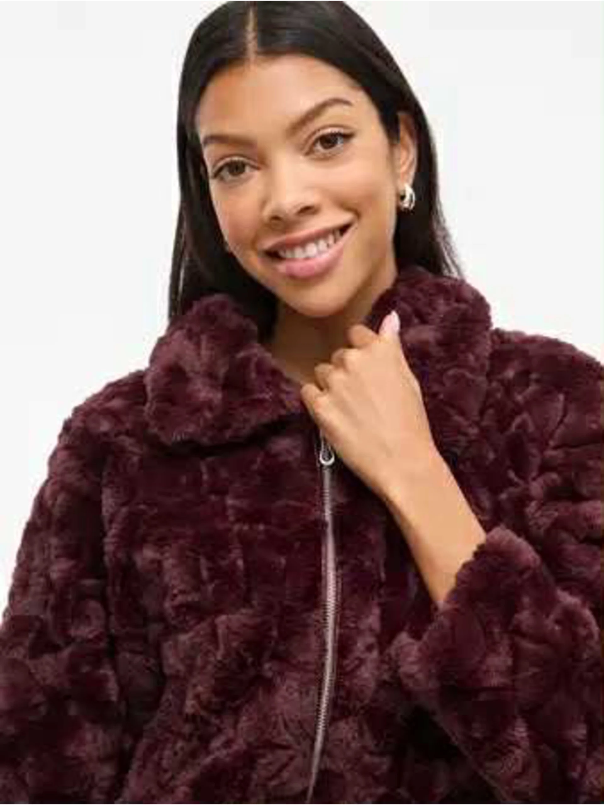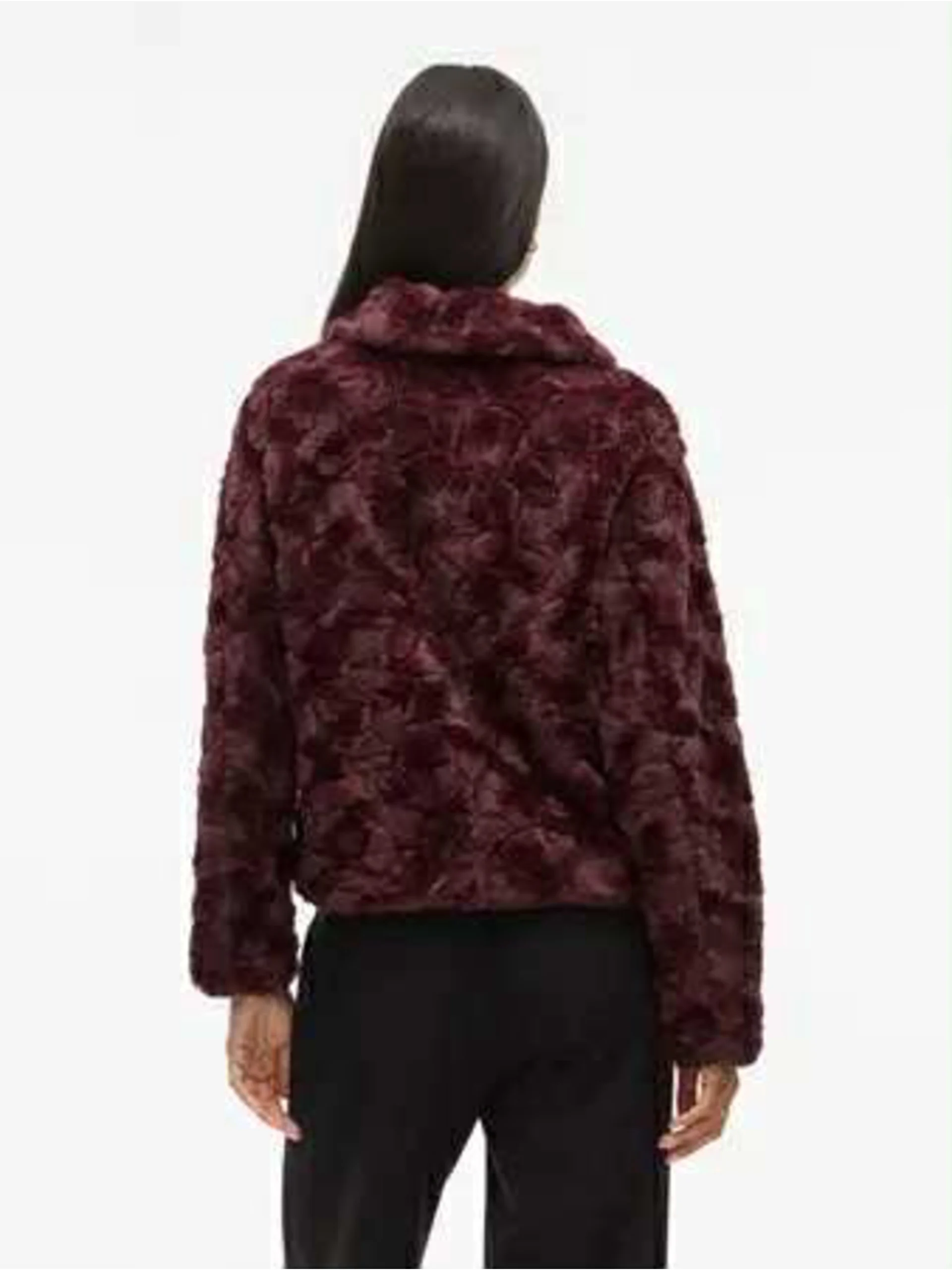 Kort jakke i fuskepels. Glidelåslukking, lommer, krage.