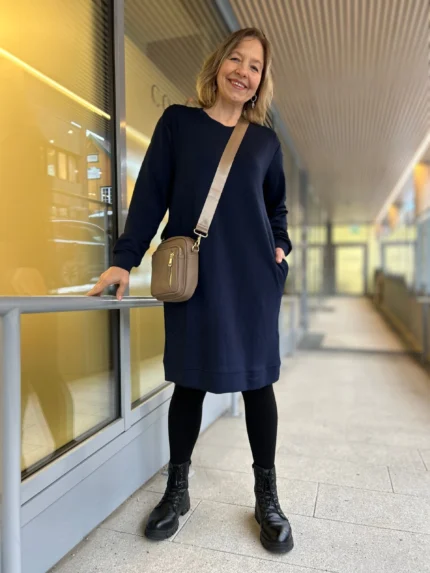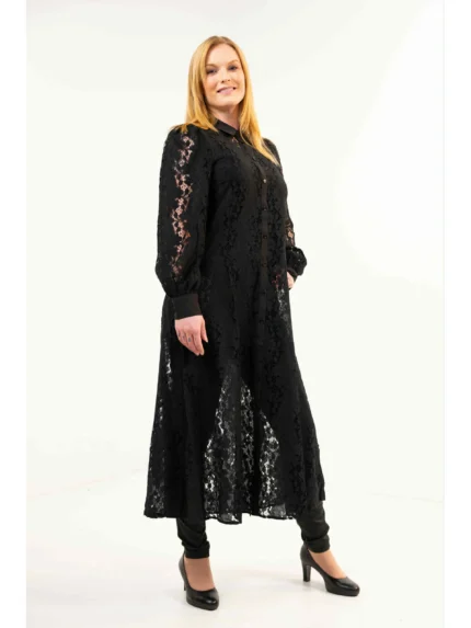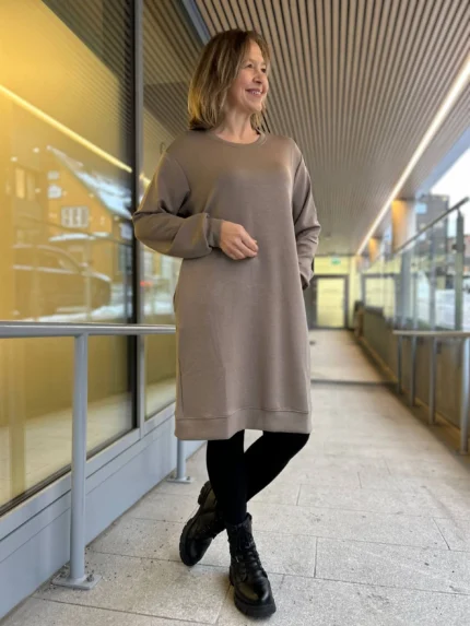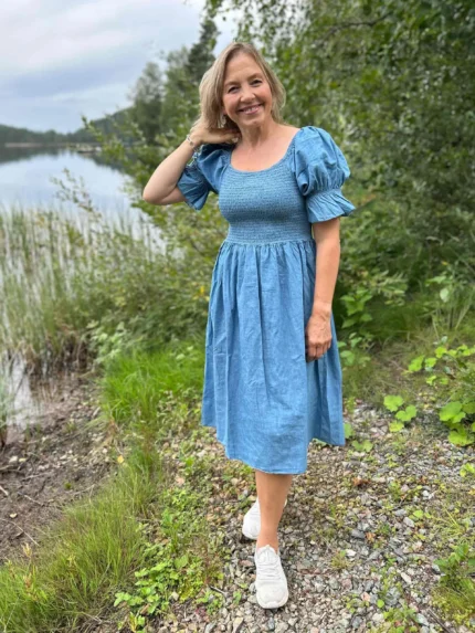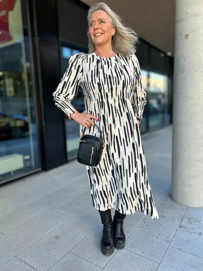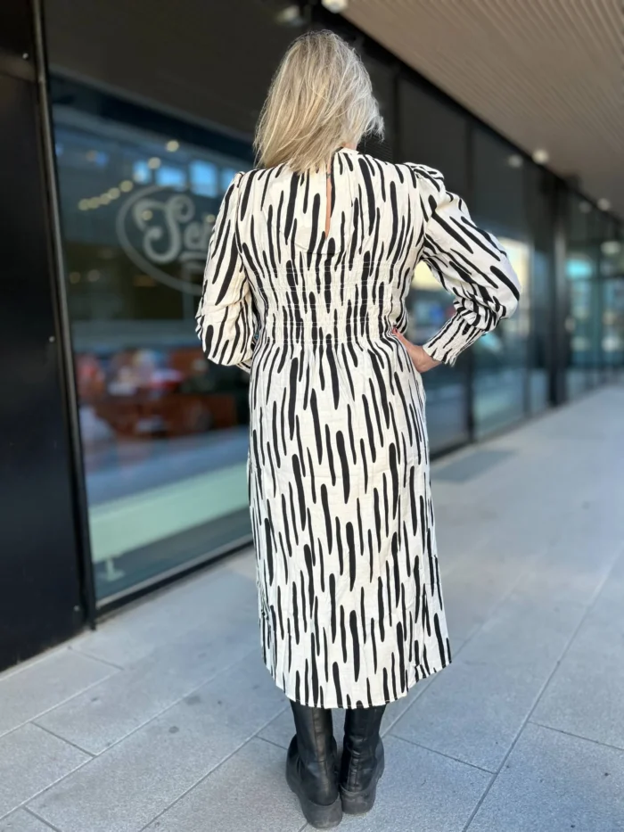 Kjole med fin fasong og smockdetaljer. Lange ermer og knappelukking i nakken.