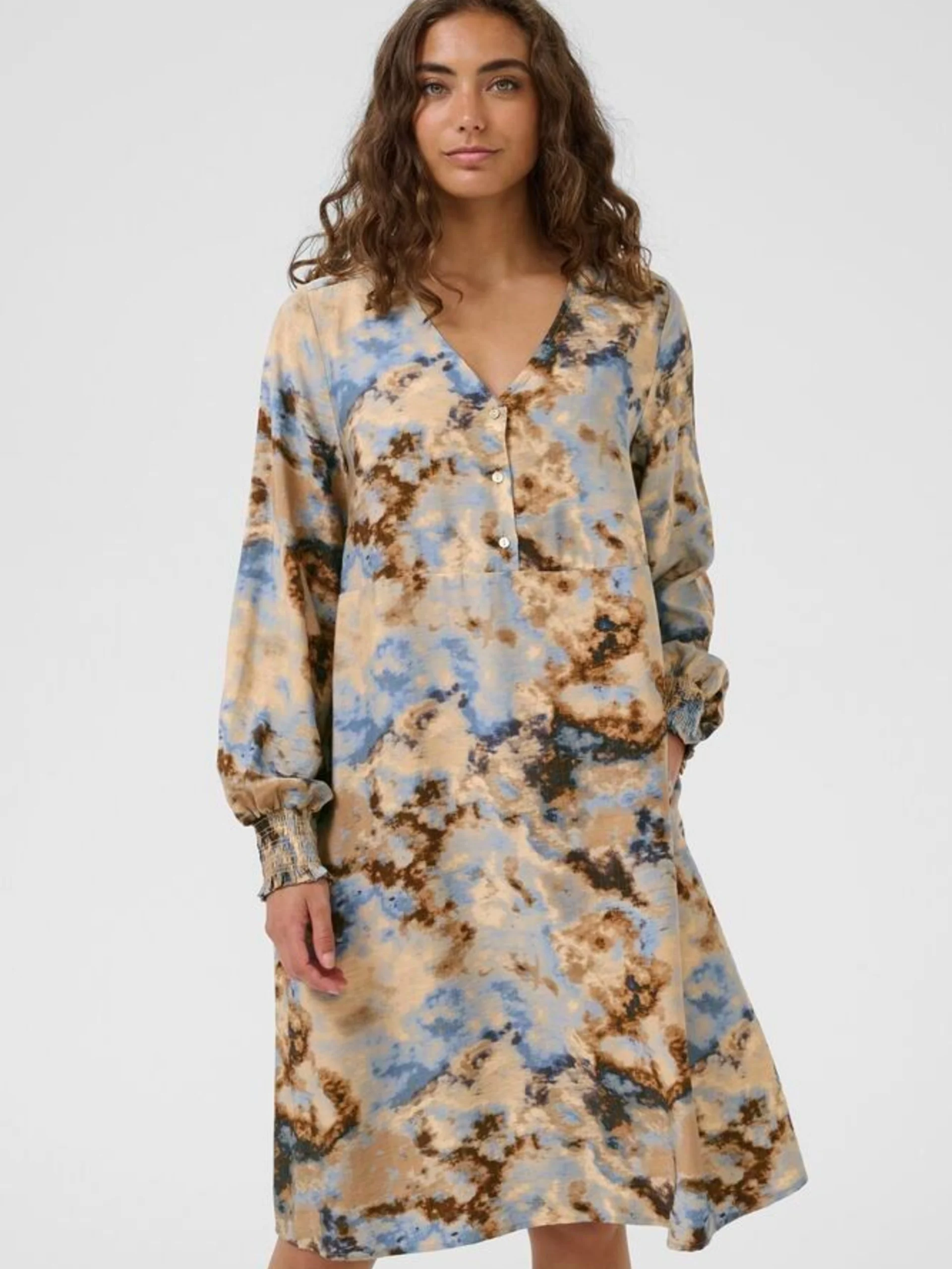 Lett kjole i fin print. A-fasong, lommer, V-hals. Tre knapper i front. Strikk i ermene.