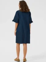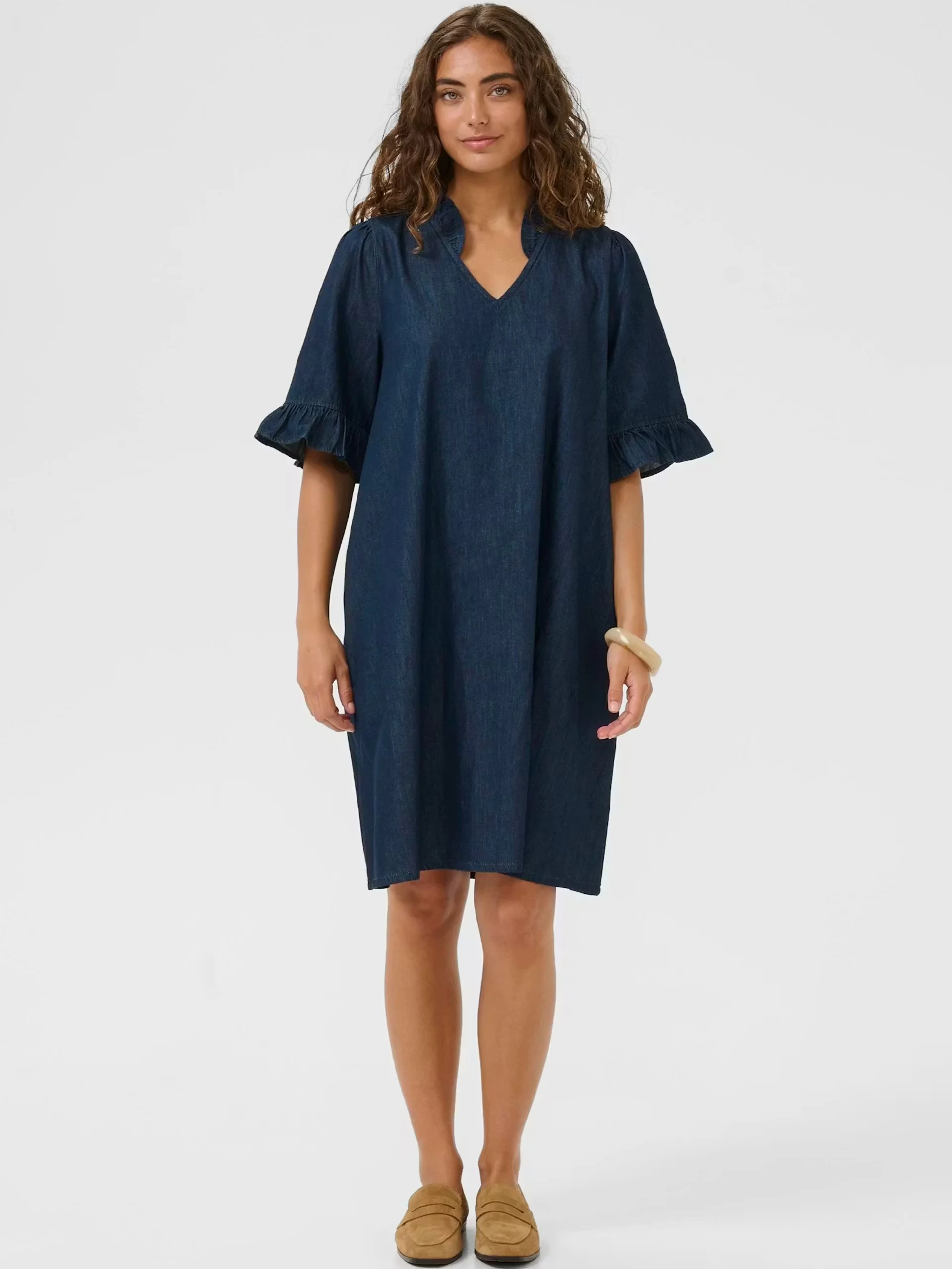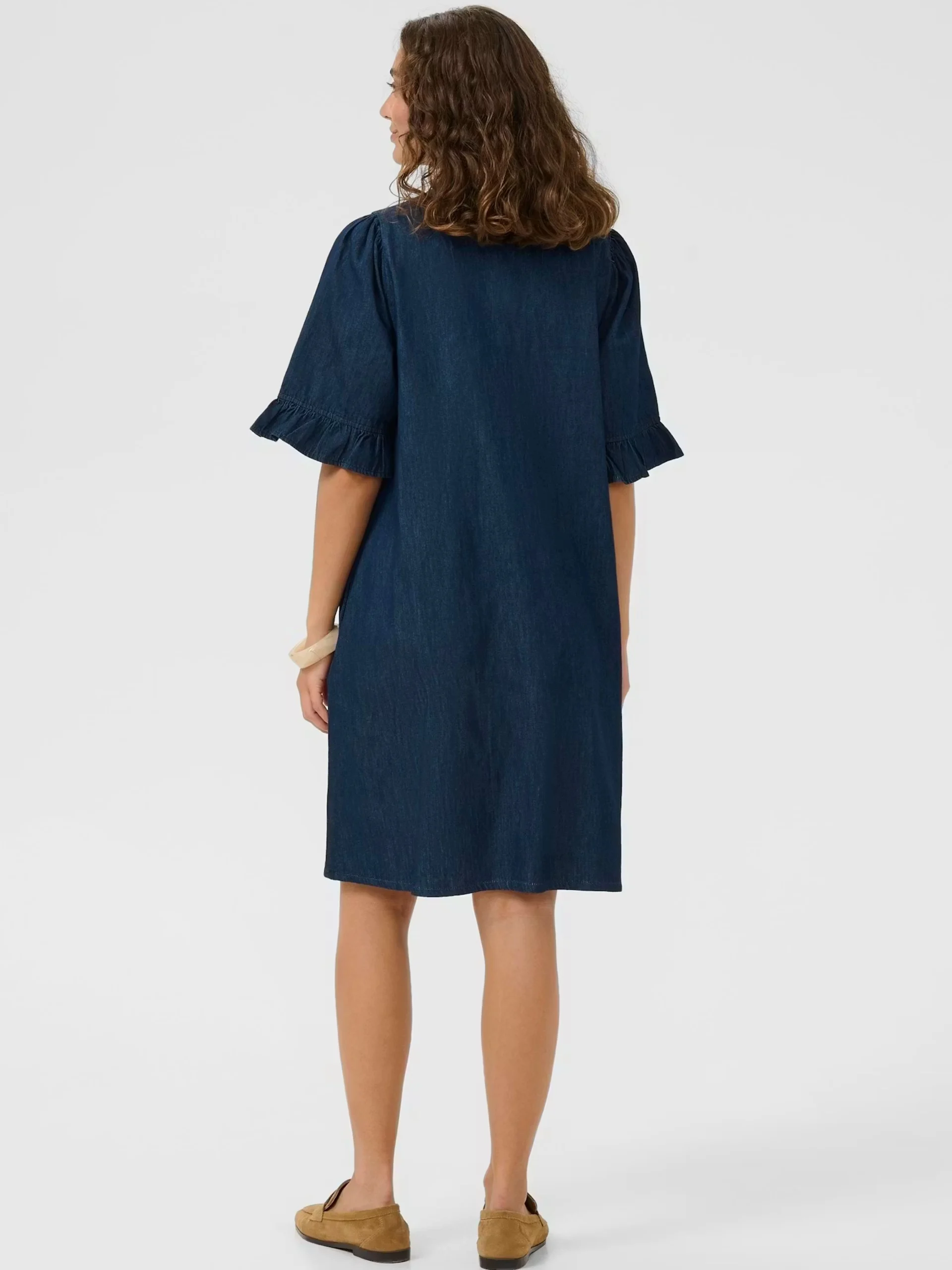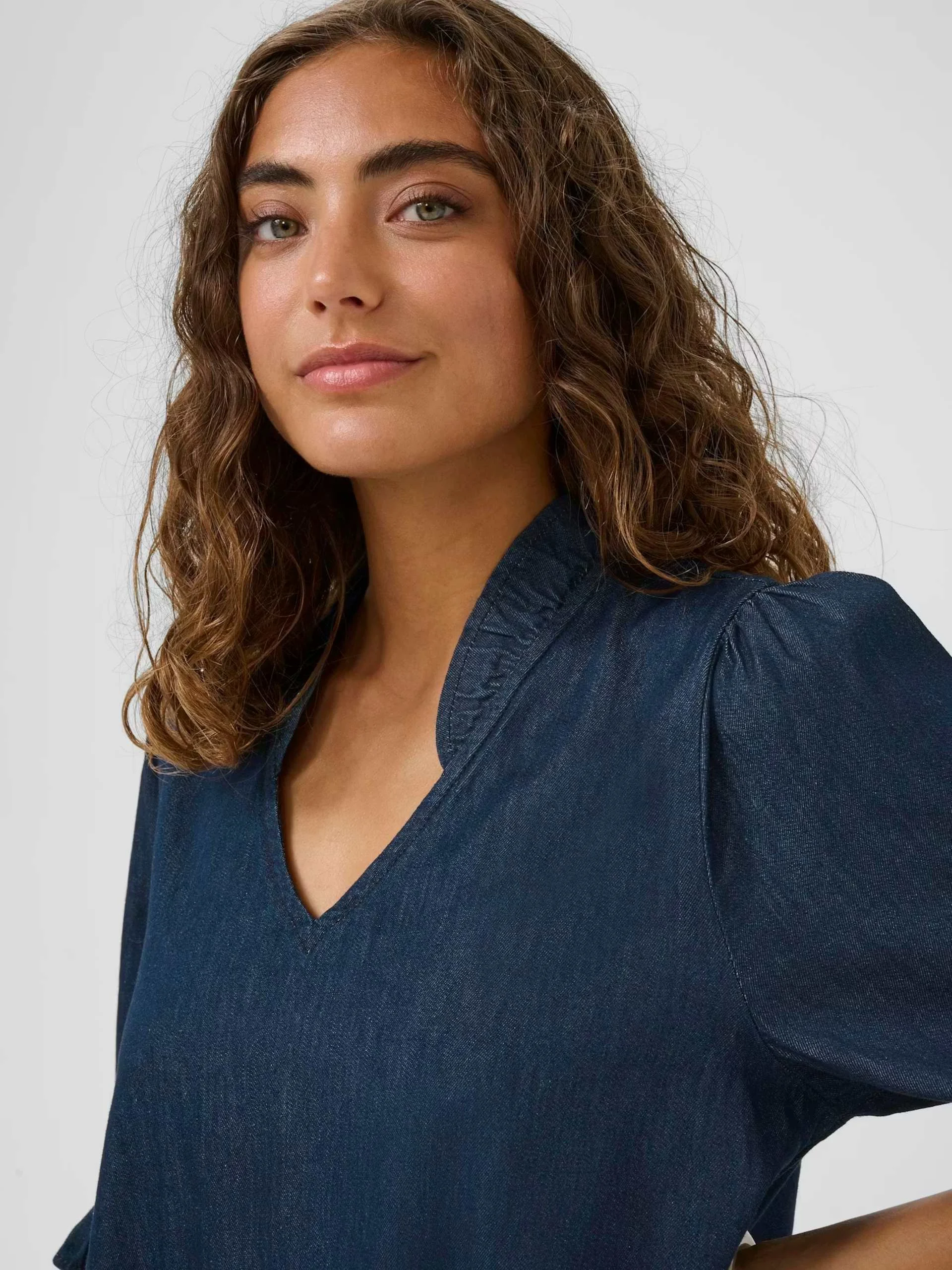 Denimkjolen har avslappet passform, V-hals og albuelange ermer med rysjer. Lommer.