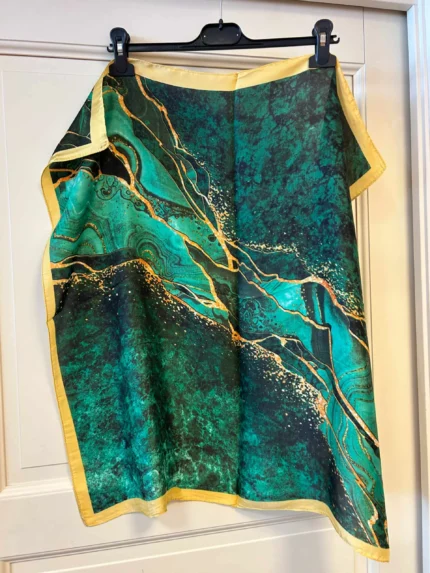 Mykt skjerf i god og kløfri kvalitet fra Kvitfjell Handbags. Flott maleri på ene siden og ensfarget blå på andre.