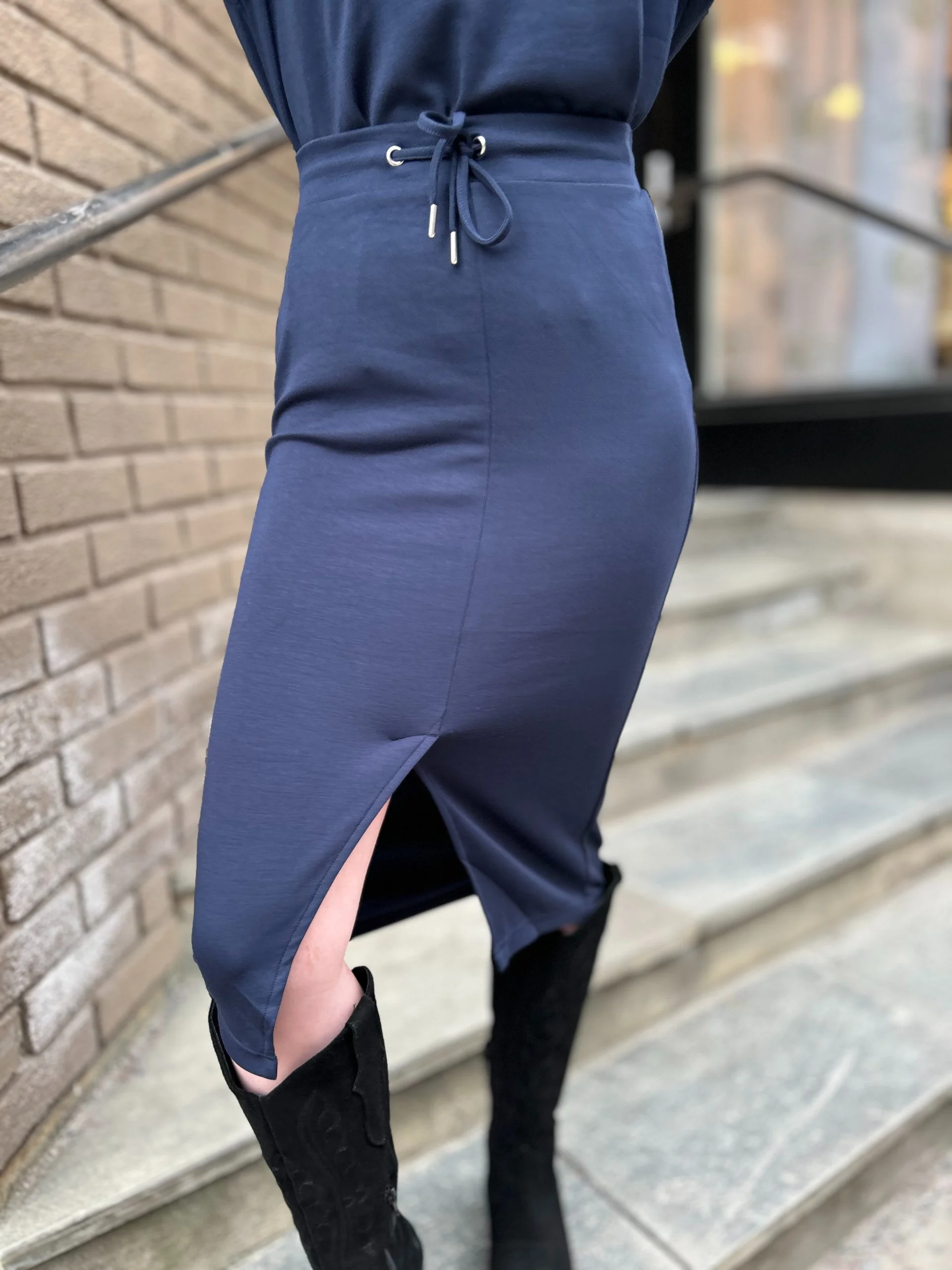 Skjørt i myk og deilig modalkvalitet med strikk i livet og rett fasong. Splitt nederst foran.