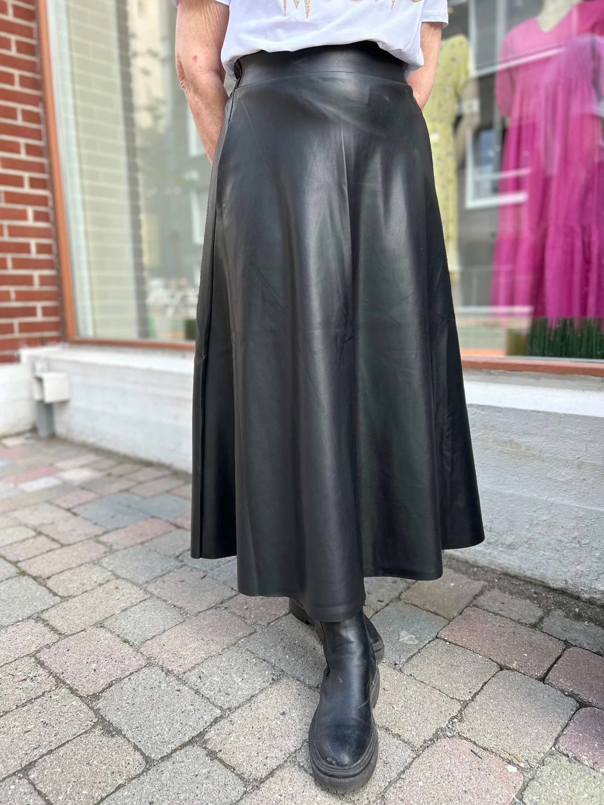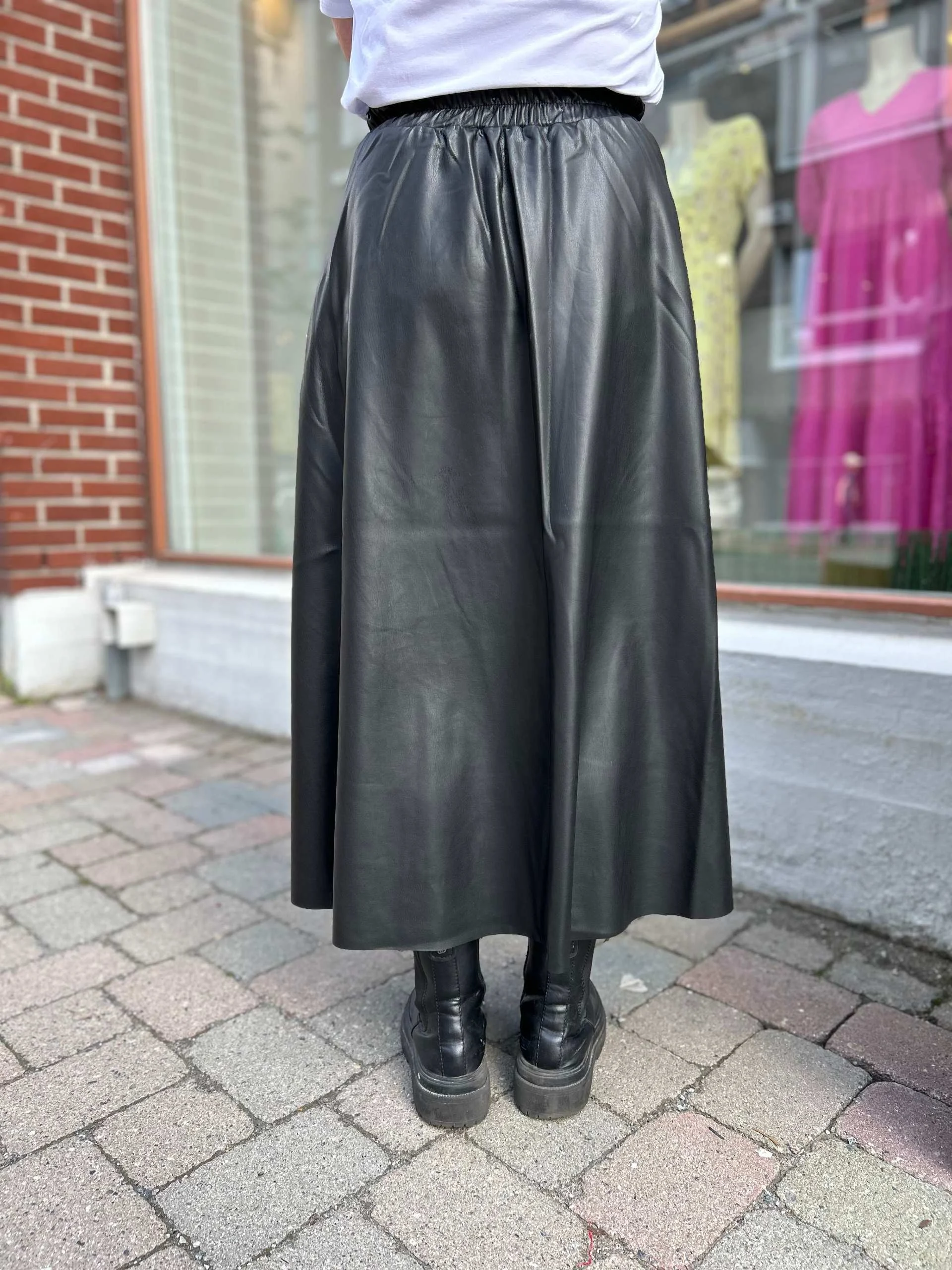 Kjempe tøft skjørt i mykt imitert skinn materiale med strikkfelt bak i ryggen, lommer i sidene og A-fasong.
