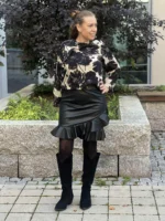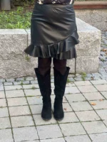 Tøft skjørt i imitert skinn med volanger. Glidelås i siden.