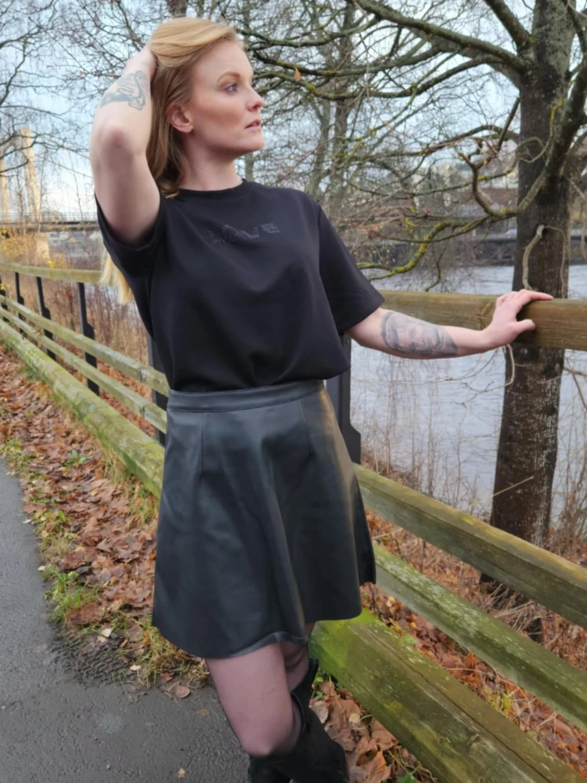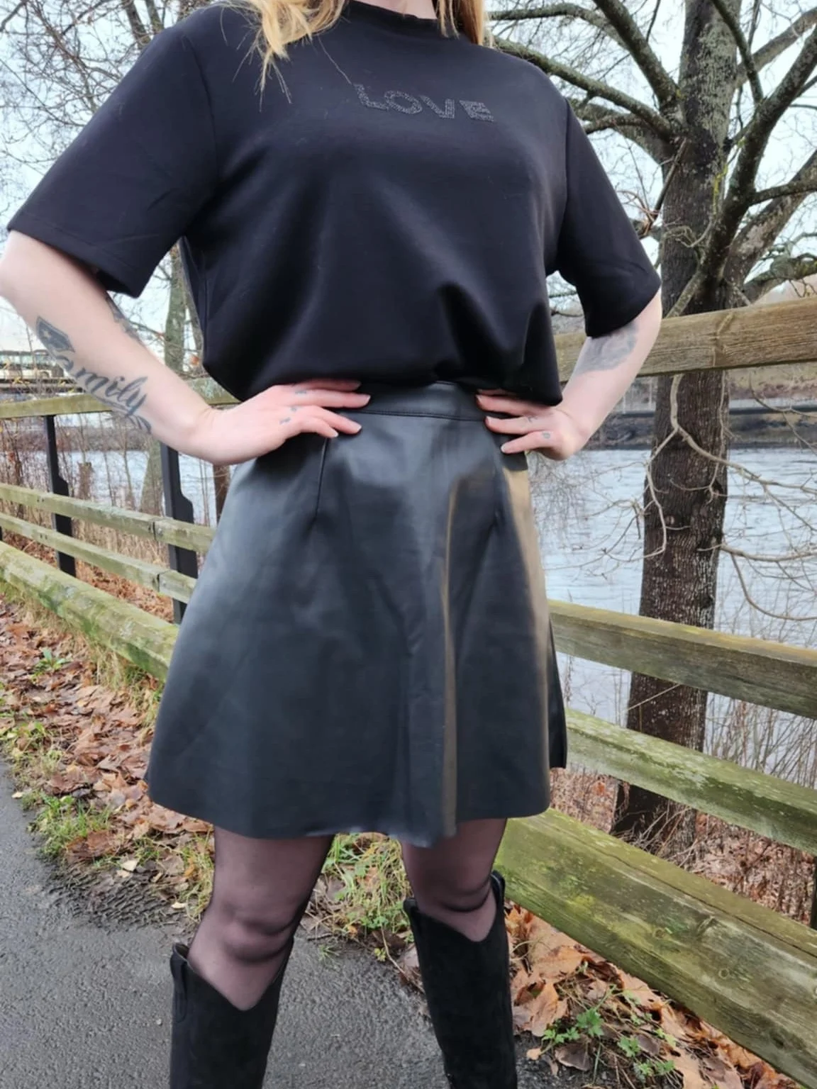 Kort skjørt i A-fasong. Glidelåslukking og strikk i livet bak. Stretchy myk kvalitet.