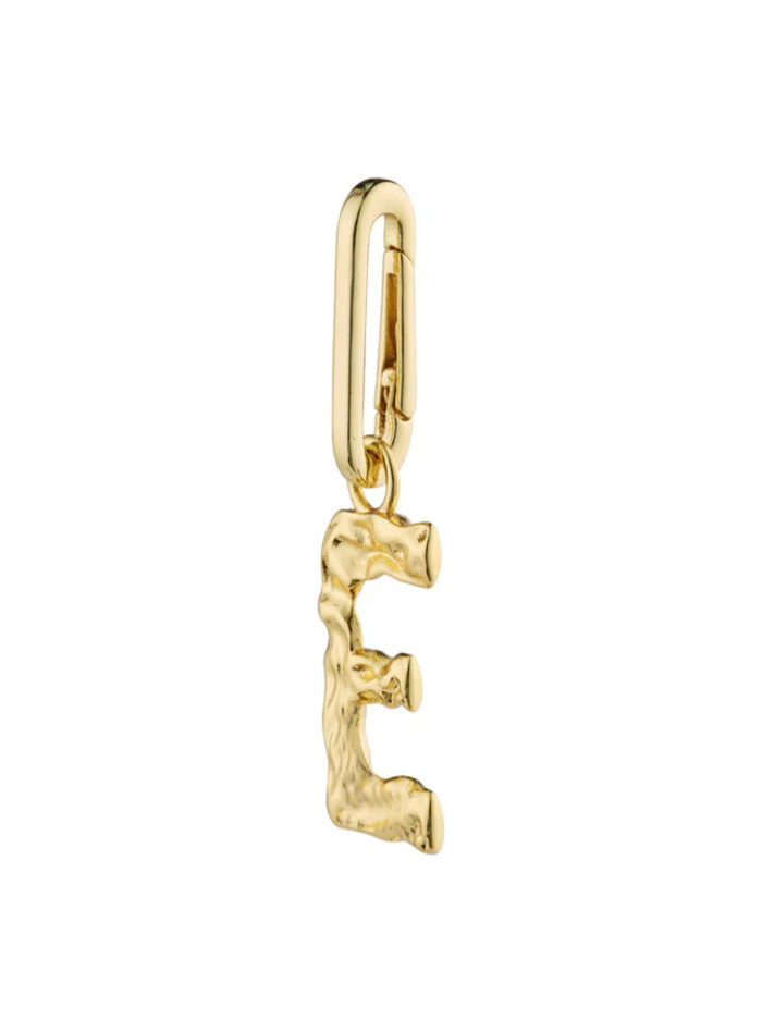 Gullbelagt charm med rustikk E, med oval karabinkrok.