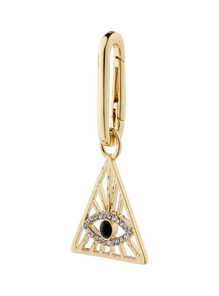 Gullbelagt trekantanheng med oval karabinkrok. Øye-motiv med svart agat og krystaller.