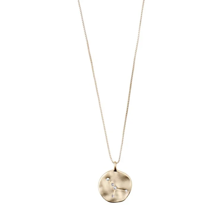Gullbelagt halskjede med stjernetegn motiv på den ene siden og stjernebilde i krystaller på den andre siden av medaljongen. Regulerbart på lengden.