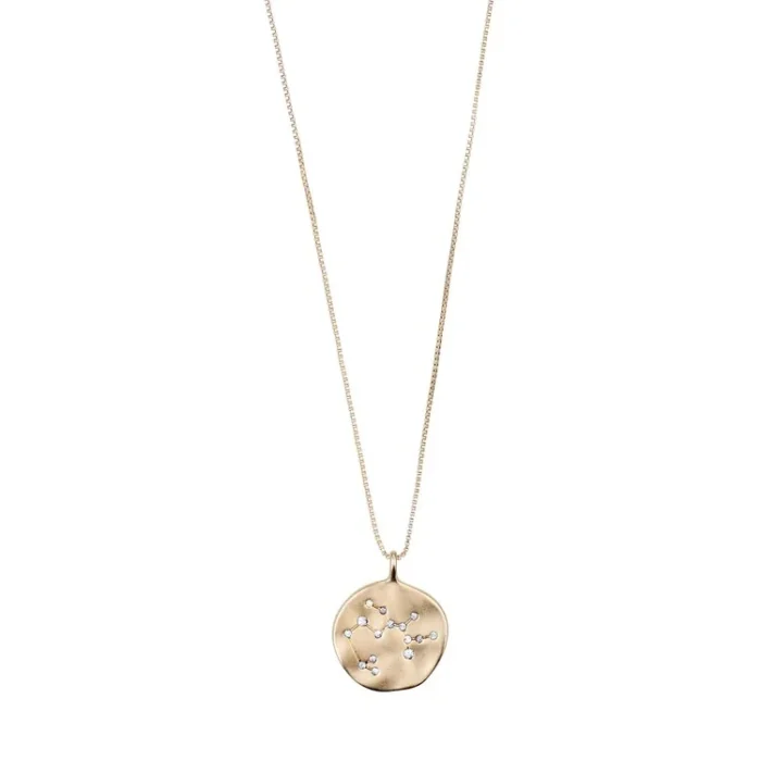 Gullbelagt halskjede med stjernetegn motiv på den ene siden og stjernebilde i krystaller på den andre siden av medaljongen. Regulerbart på lengden.