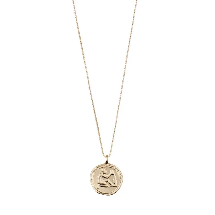 Gullbelagt halskjede med stjernetegn motiv på den ene siden og stjernebilde i krystaller på den andre siden av medaljongen. Regulerbart på lengden.