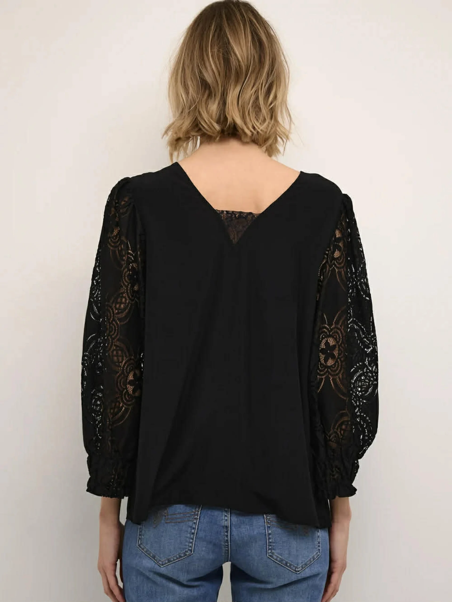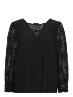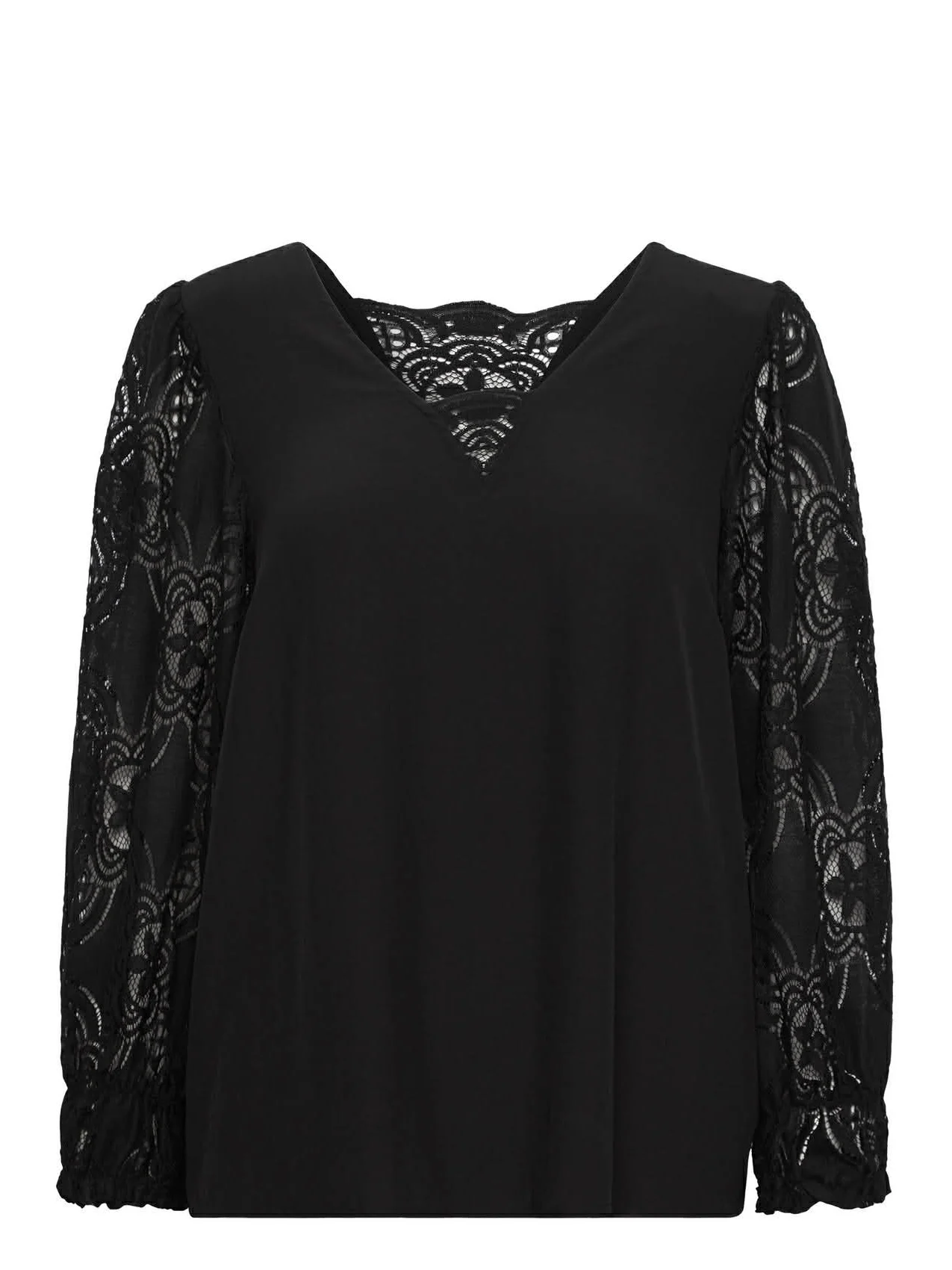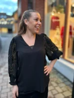Lett bluse med blondedetaljer. V-hals. 3/4 ermlengde med strikk.