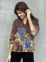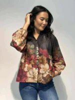 Lett bluse med blomsterprint, knapper hele veien i front og strikk i ermene.