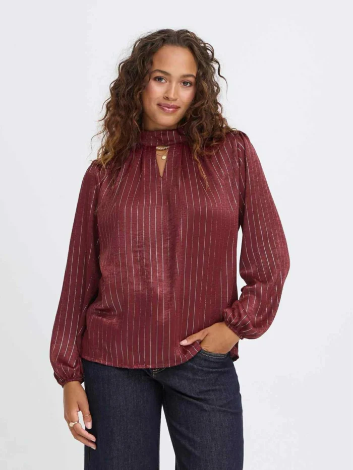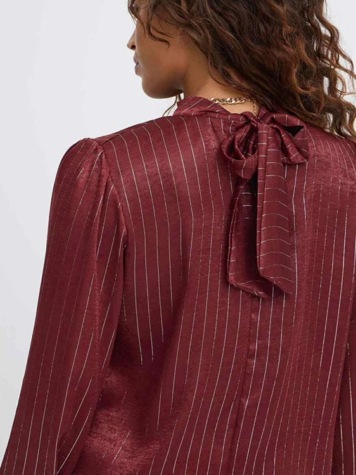 Fin bluse med sølvtråder og sløyfe på nakken. Lange ermer med strikk.