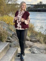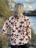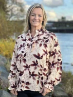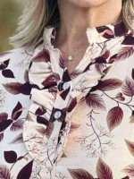 Fin og lett bluse, lange ermer med strikk nederst, liten stolpe med tre knapper og volang rundt.