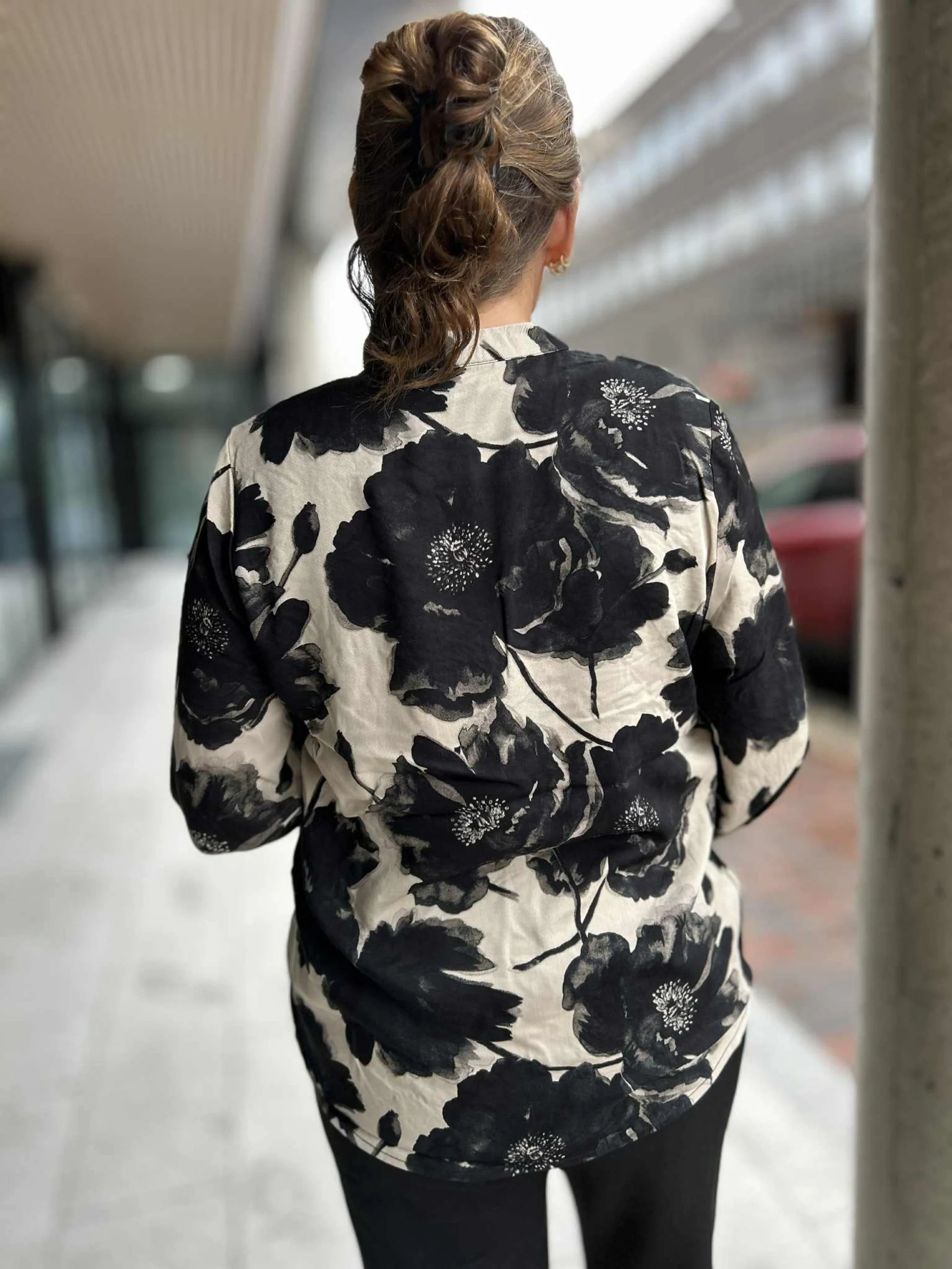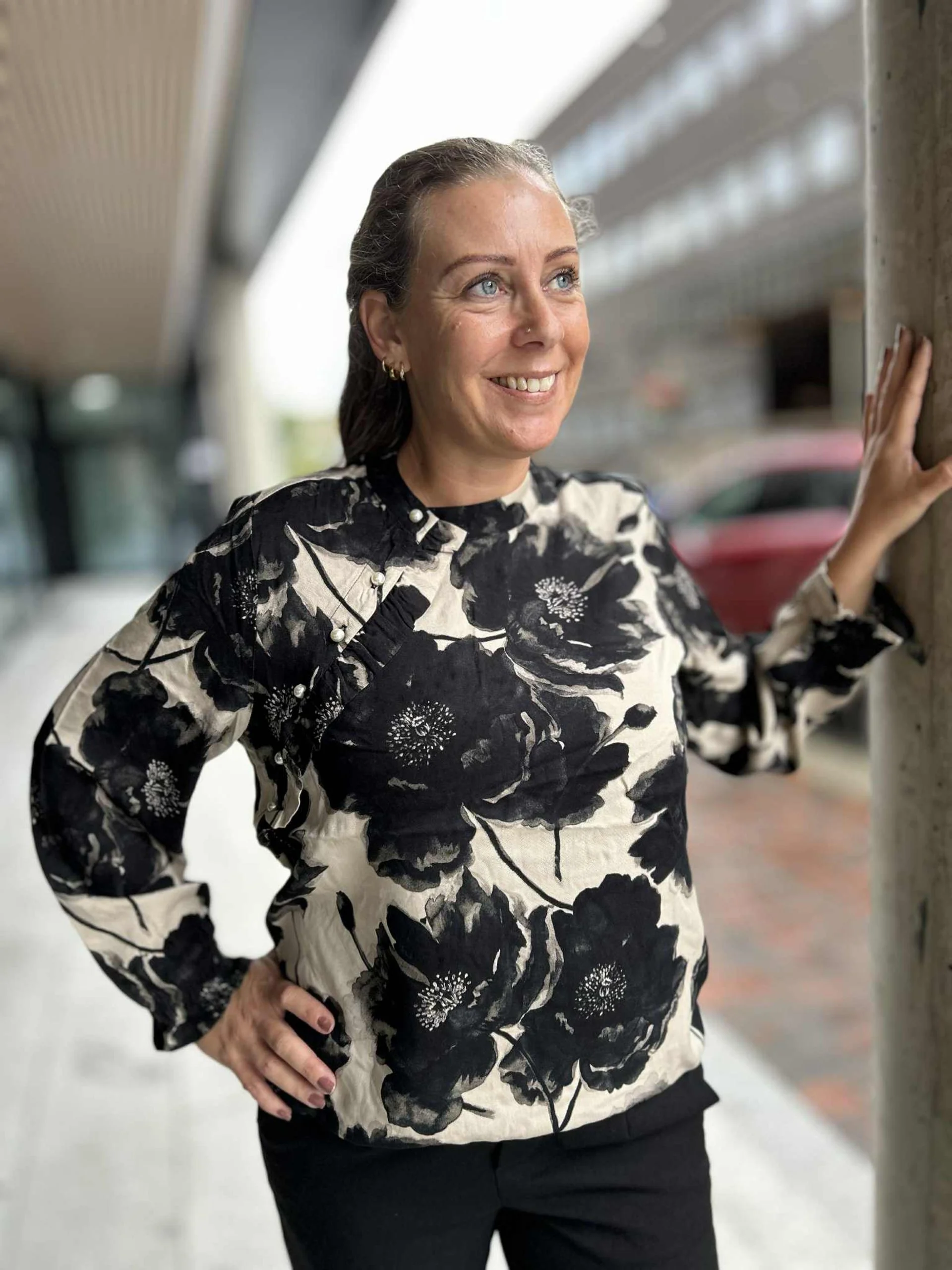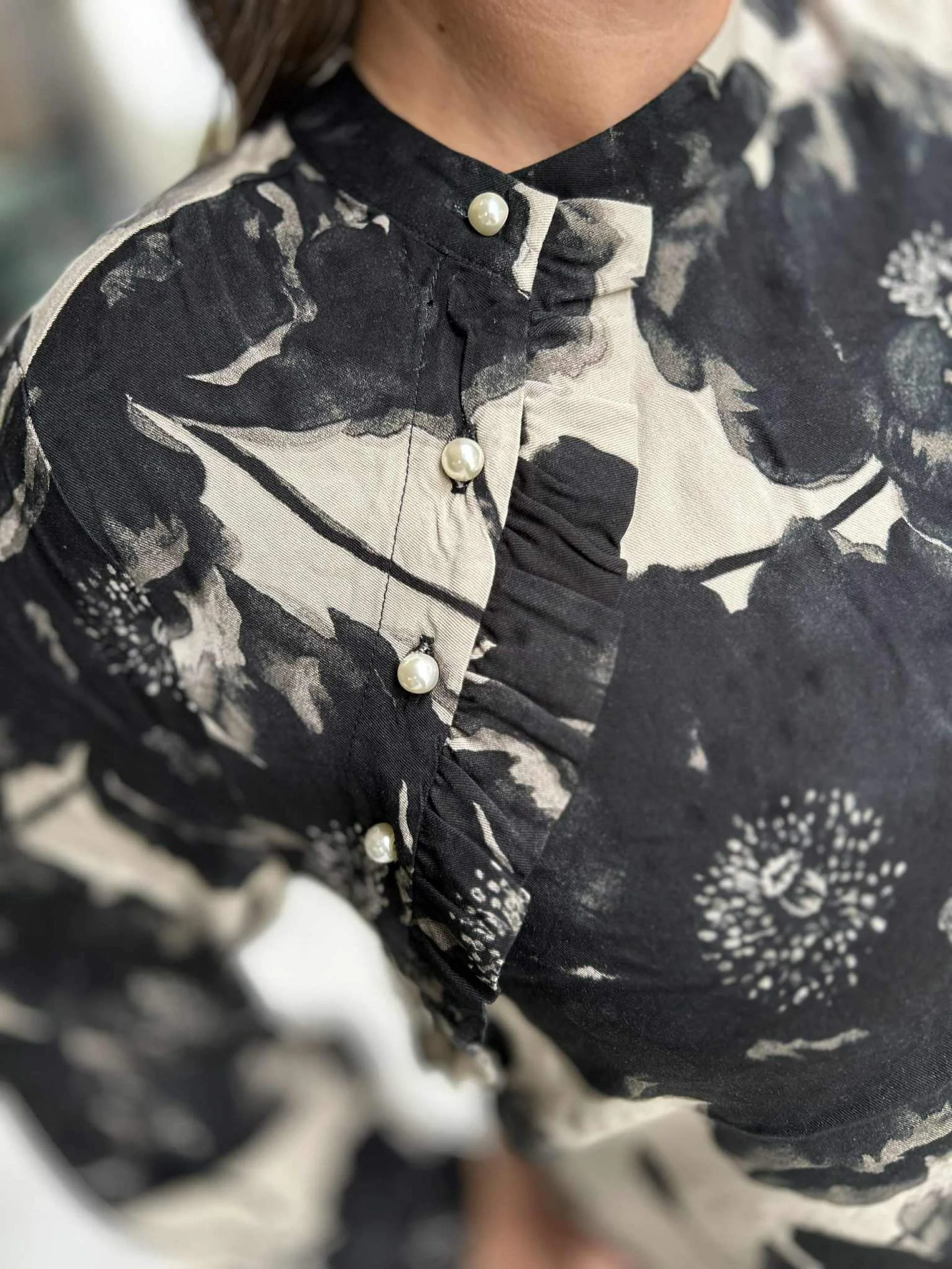 Nydelig bluse med dekorative knapper og liten volang ved knappene. Ikke helt lange ermer med strikk.