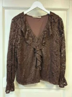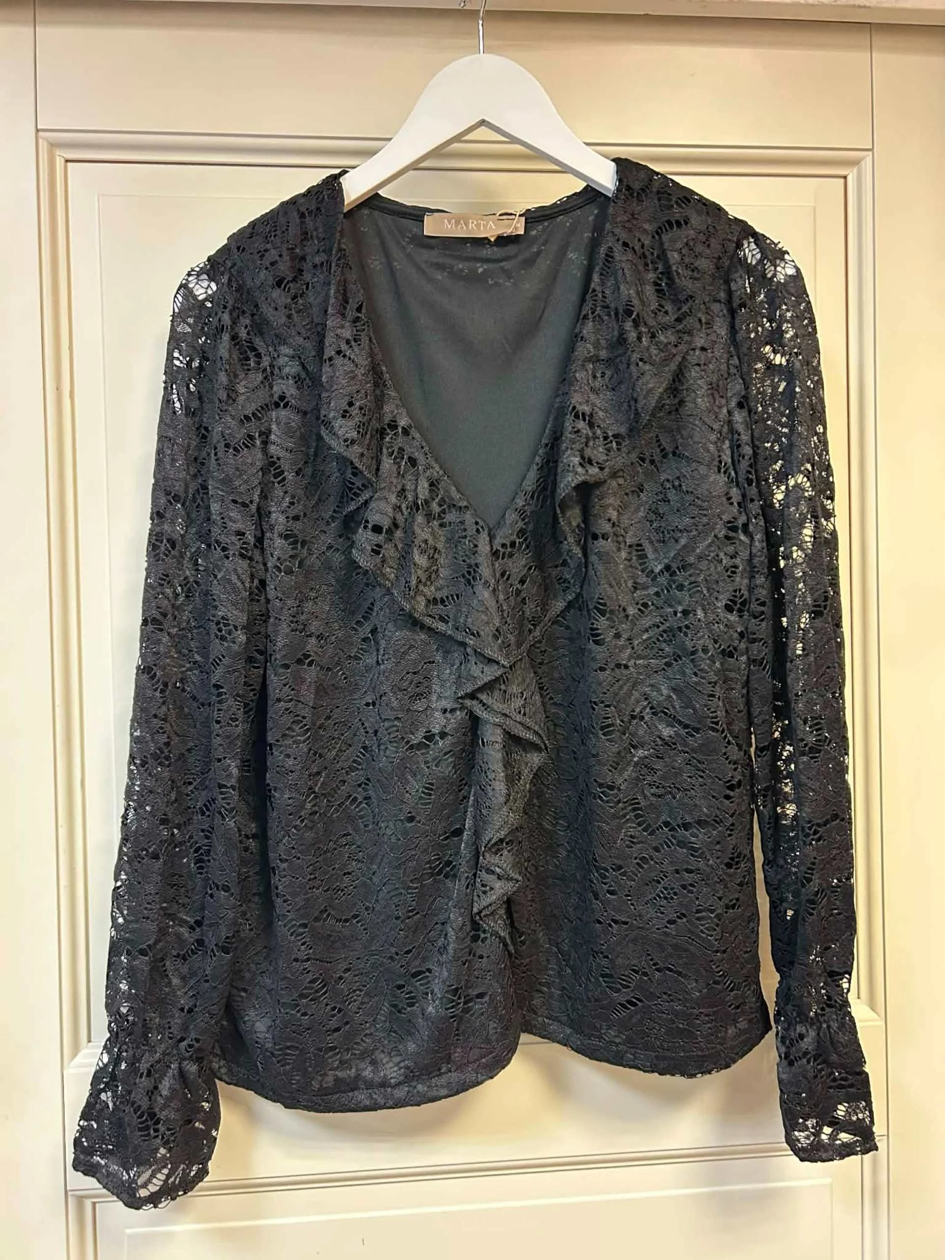 Fin blondetopp med volanger ved utring. V-hals. Lange ermer med strikk. Fôret. Ledig fasong