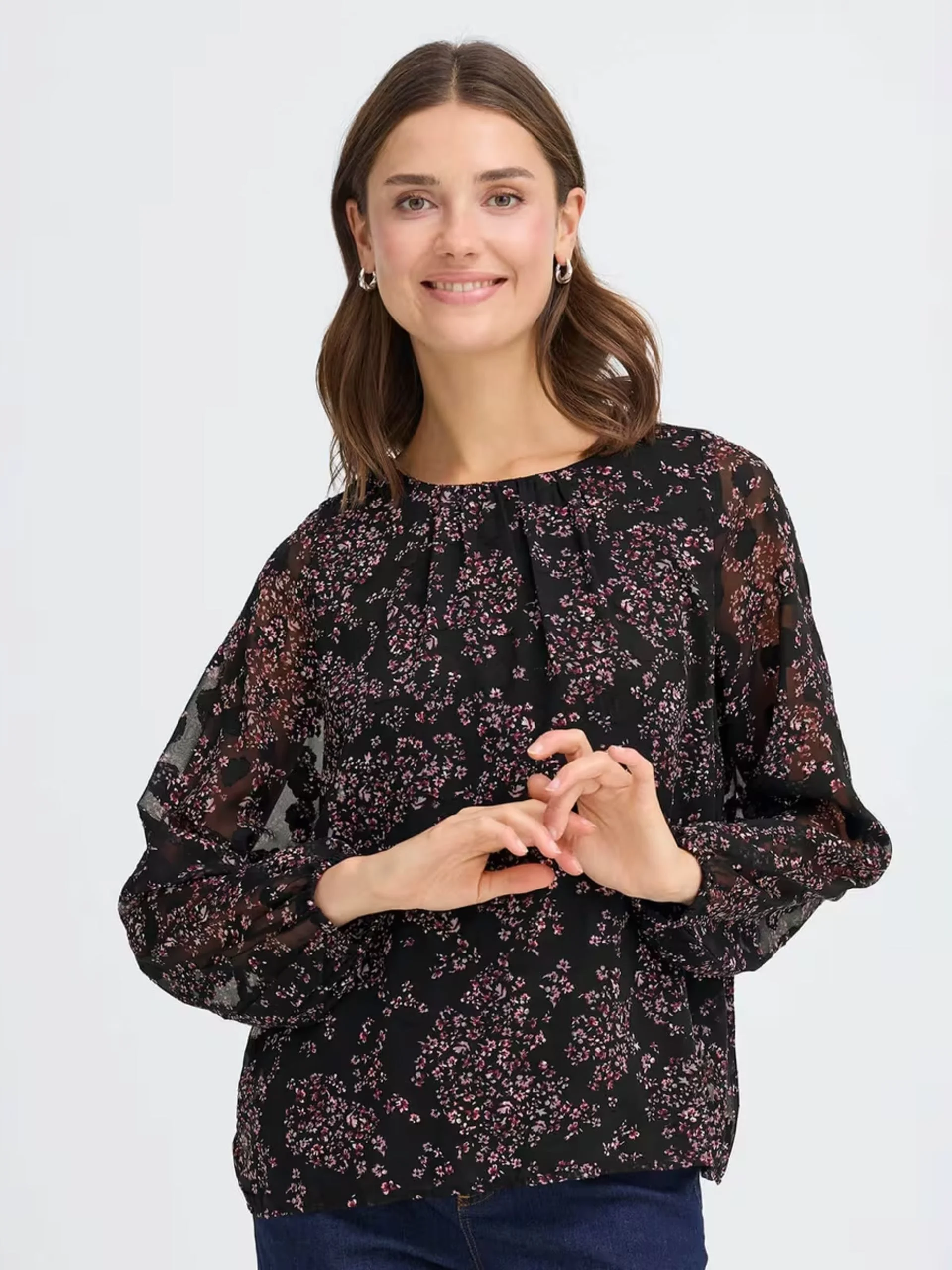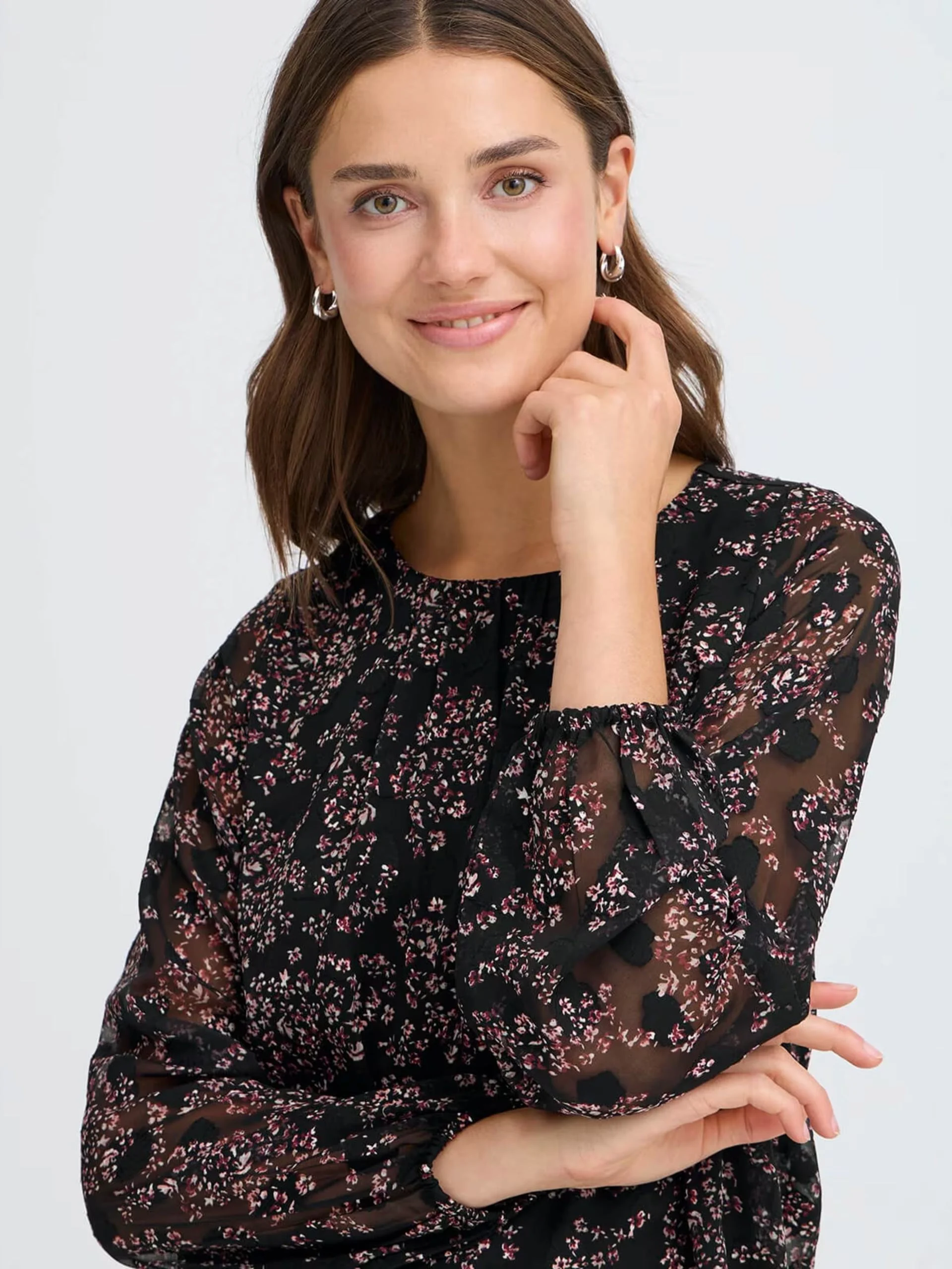 Fin bluse med halvtransparente ermer med strikk. Rund hals, rett fasong. Fôret