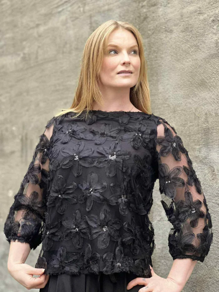 Flott topp med halvtransparente ermer. Fôret med 3/4 ermlengde.