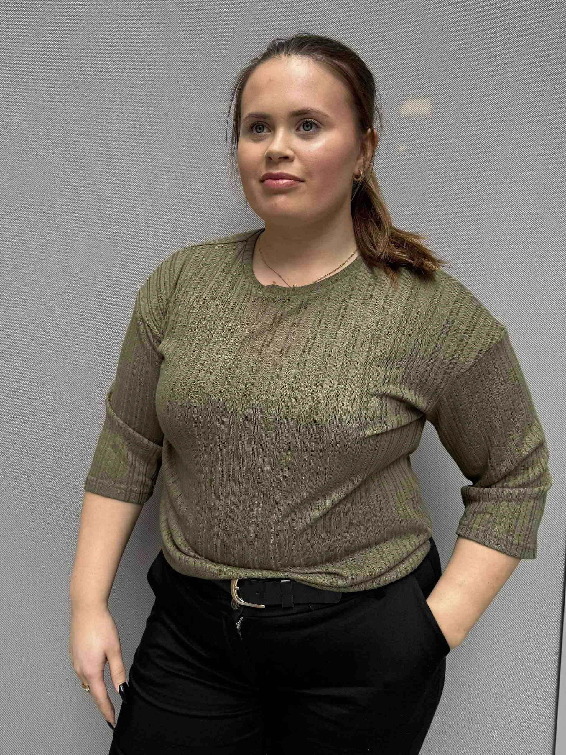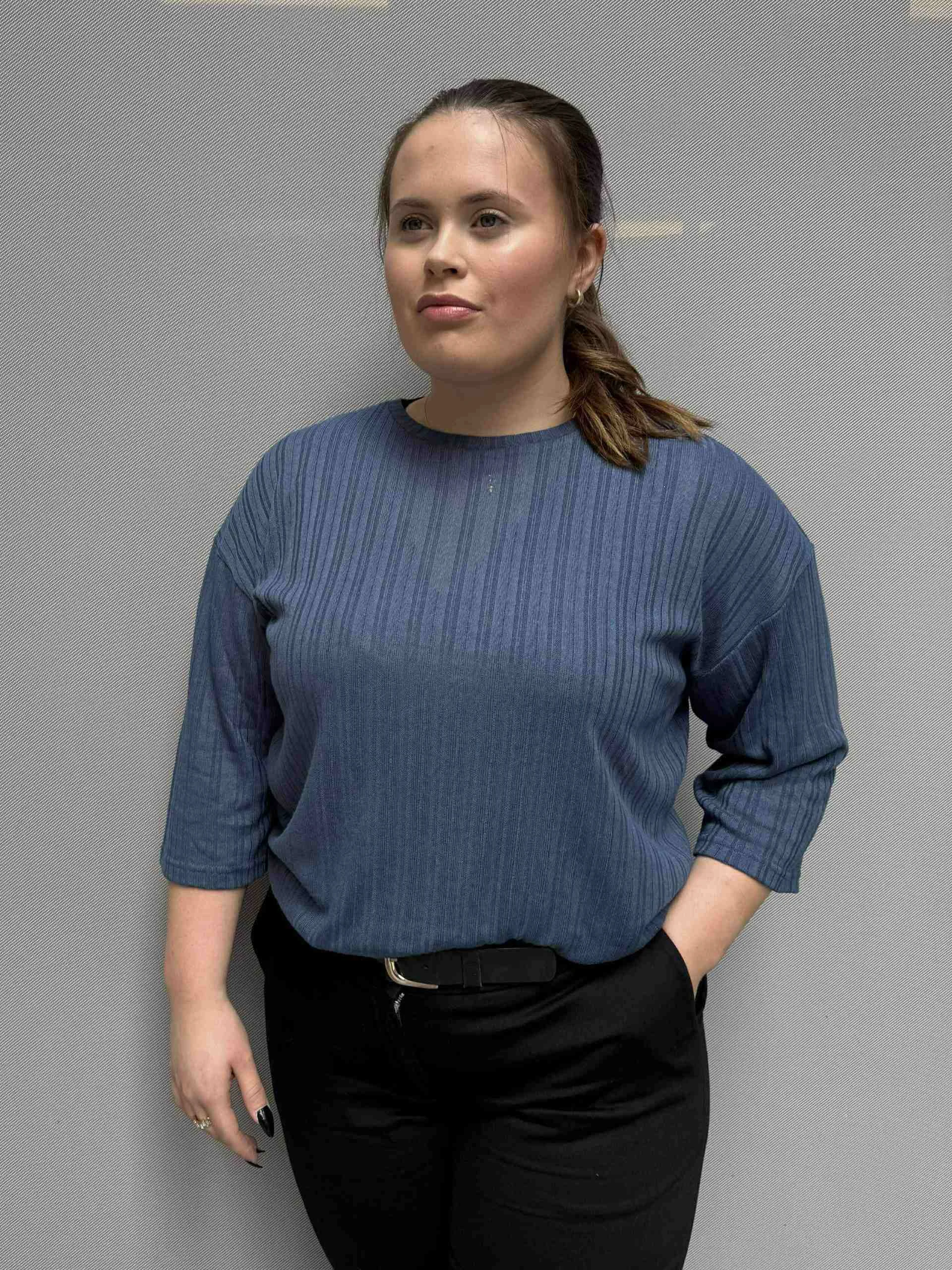Behagelig topp med loddrett stripemønster, vide ermer og myk strikk nederst i livet.