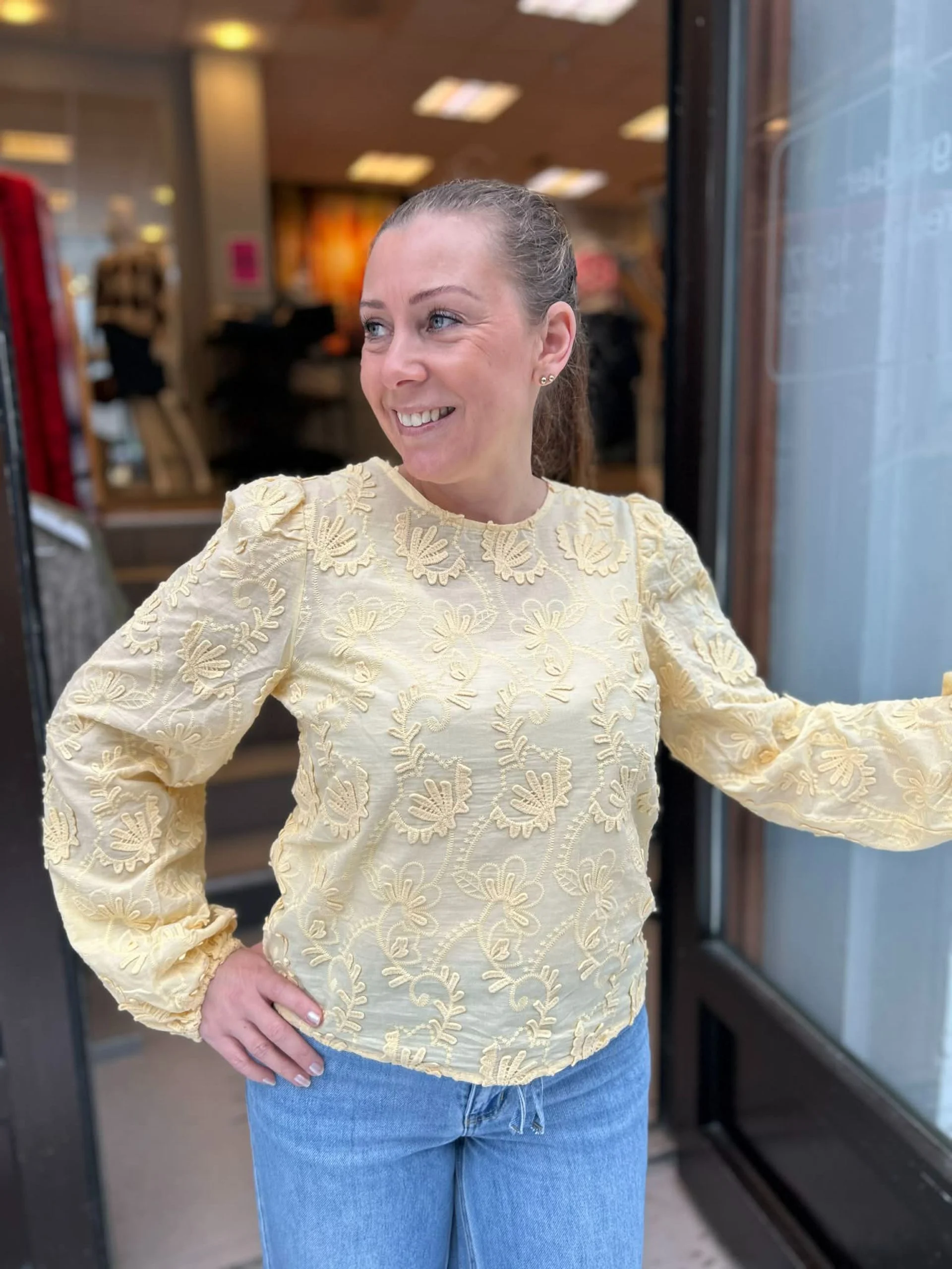 Nydelig vårlig topp med 3D effekt. Lange ermer med strikk. 3 knapper på nakken.