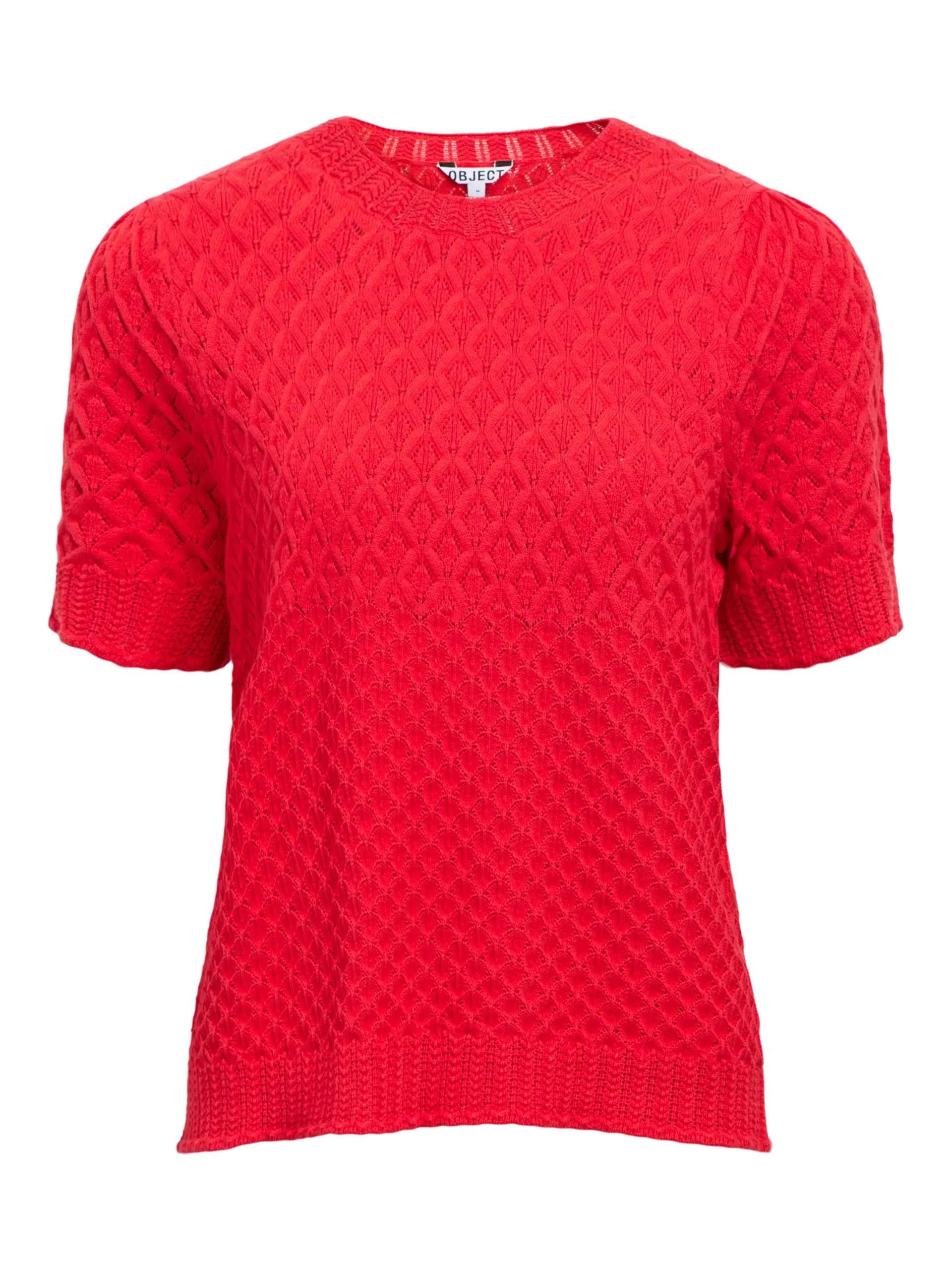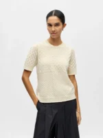 Nydelig vårlig topp med fin strikkemønster. Rett fasong. Korte ermer.