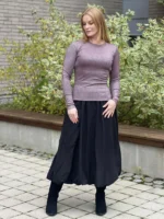 Ettersittende topp med sølvtråder. Rund hals, lange ermer.