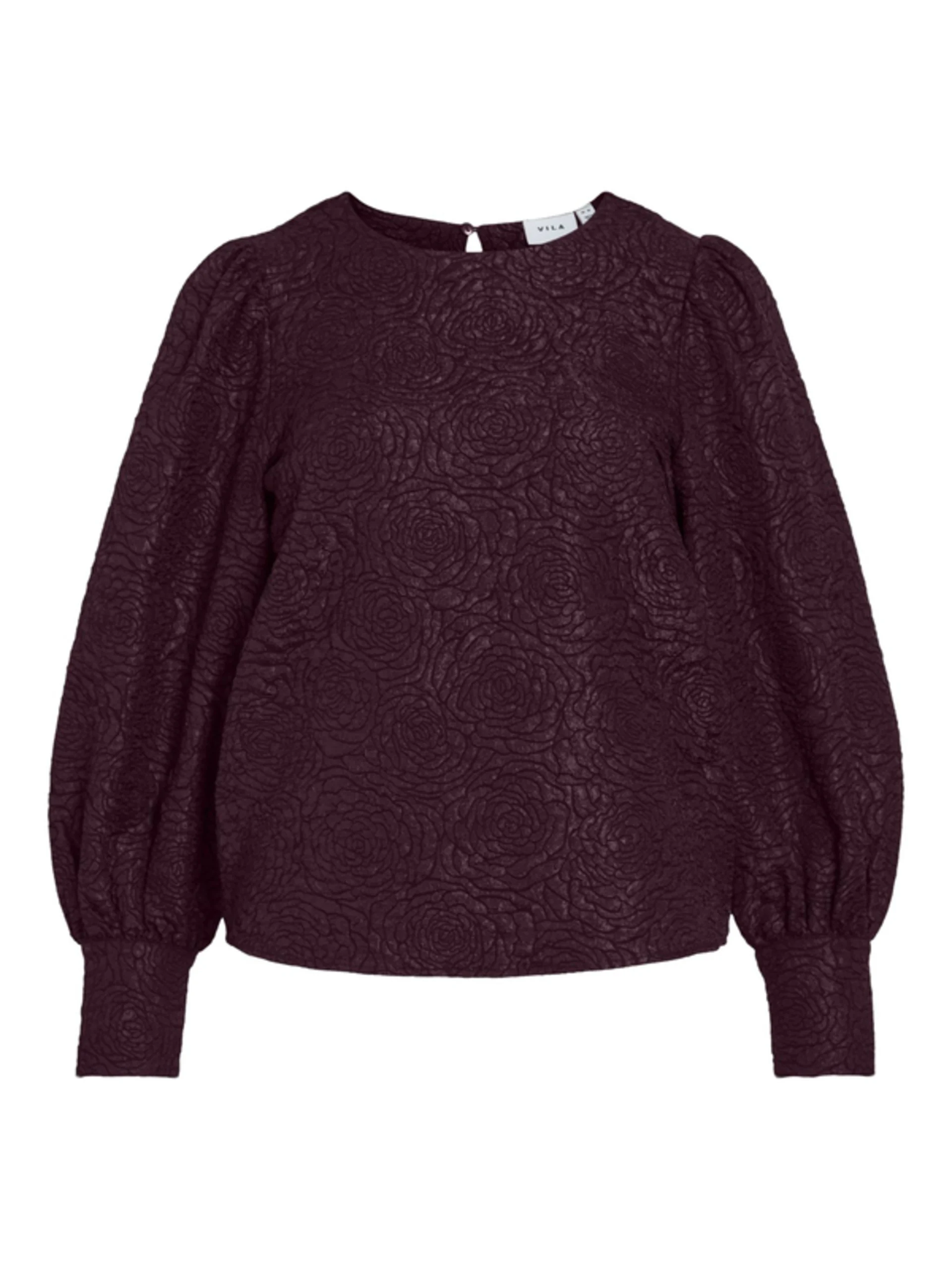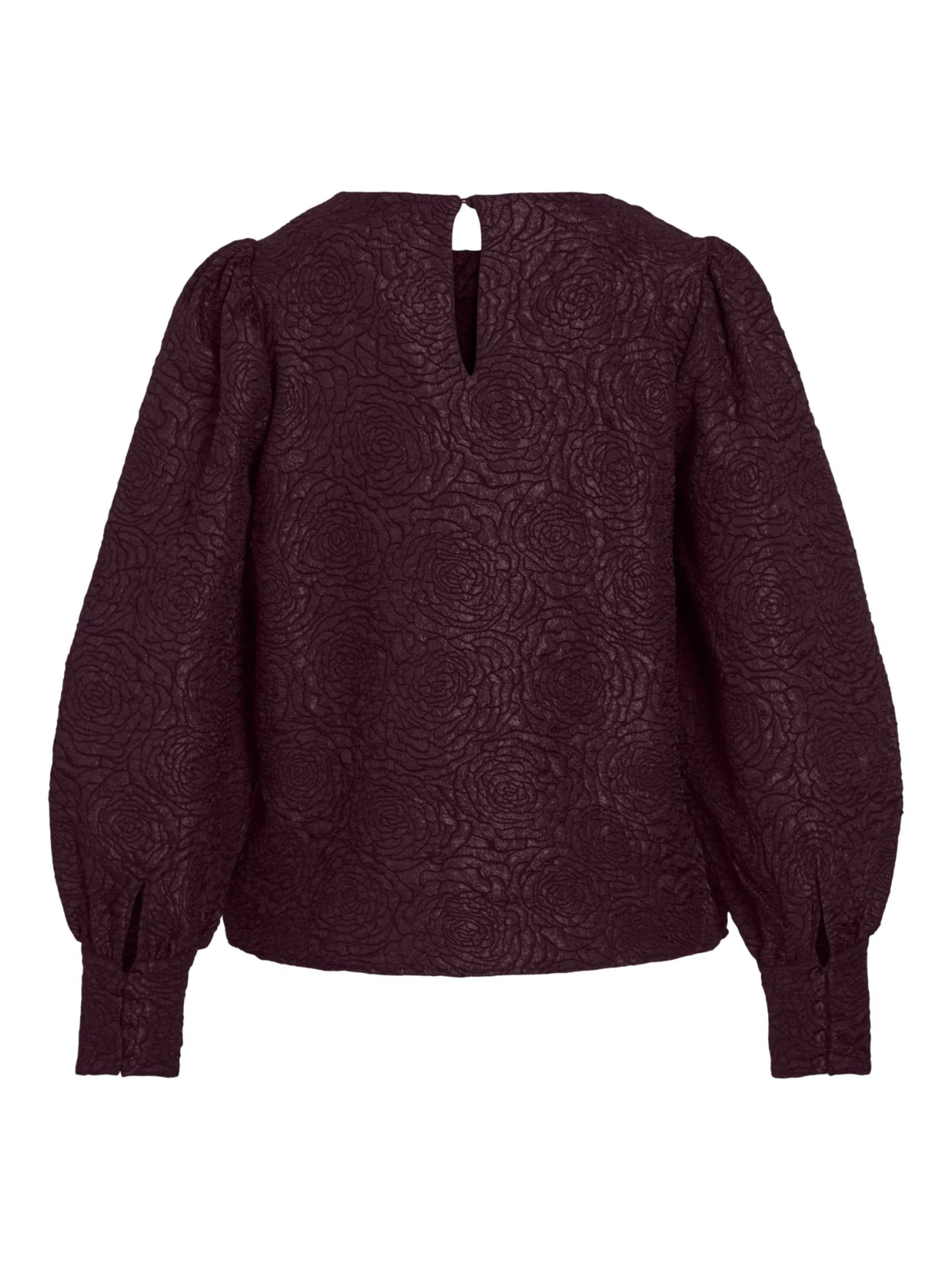 Fin bluse i jaquardstoff med lange ermer. Mansjett med 4 knapper og 1 knapp ved nakken. Rett fasong.