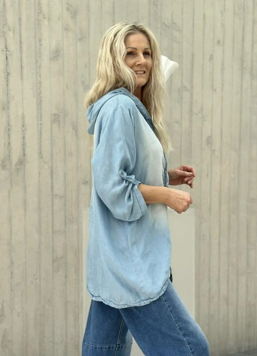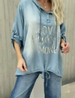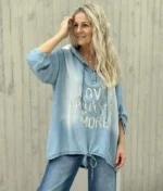 Tøff tunika/bluse i lett lyocell kvalitet. Hette med knyting, knyting nederst. Litt lengere bak enn foran.