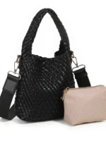 Flettet veske med håndtak. Lang regularbar skulderreim og liten toalettmappe med glidelås følger med.