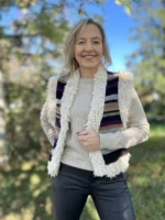 Kort vest med blandede materialer, fuskepels langs kanter og peace merke på ryggen.